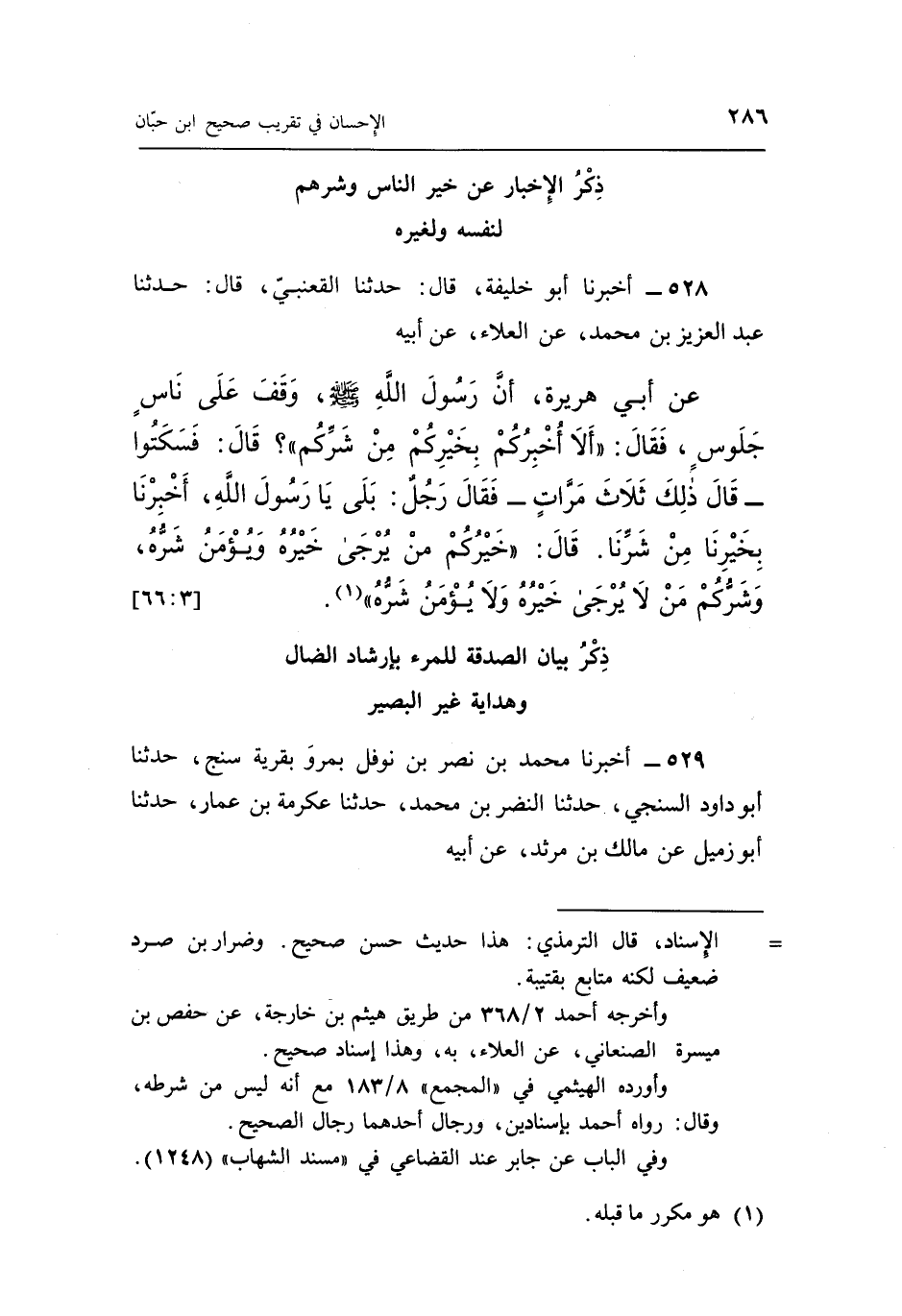 عَنْ أَبِي هُرَيْرَةَ أَنَّ رَسُولَ اللَّهِ صَلَّى اللَّهُ عَلَيْهِ وَسَلَّمَ وَقَفَ عَلَى نَاسٍ جُلُوسٍ فقَالَ "أَلَا أُخْبِرُكُمْ بِخَيْرِكُمْ مِنْ شَرِّكُمْ قَالَ فَسَكَتُوا قَالَ ذَلِكَ ثَلَاثَ مَرَّاتٍ فقَالَ رَجُلٌ بَلَى يَا رَسُولَ اللَّهِ أَخْبِرْنَا بِخَيْرِنَا مِنْ شَرِّنَا قَالَ خَيْرُكُمْ مَنْ يُرْجَى خَيْرُهُ وَيُؤْمَنُ شَرُّهُ وَشَرُّكُمْ مَنْ لَا يرجى خيره ولا يؤمن شره" 1. [3: 66]