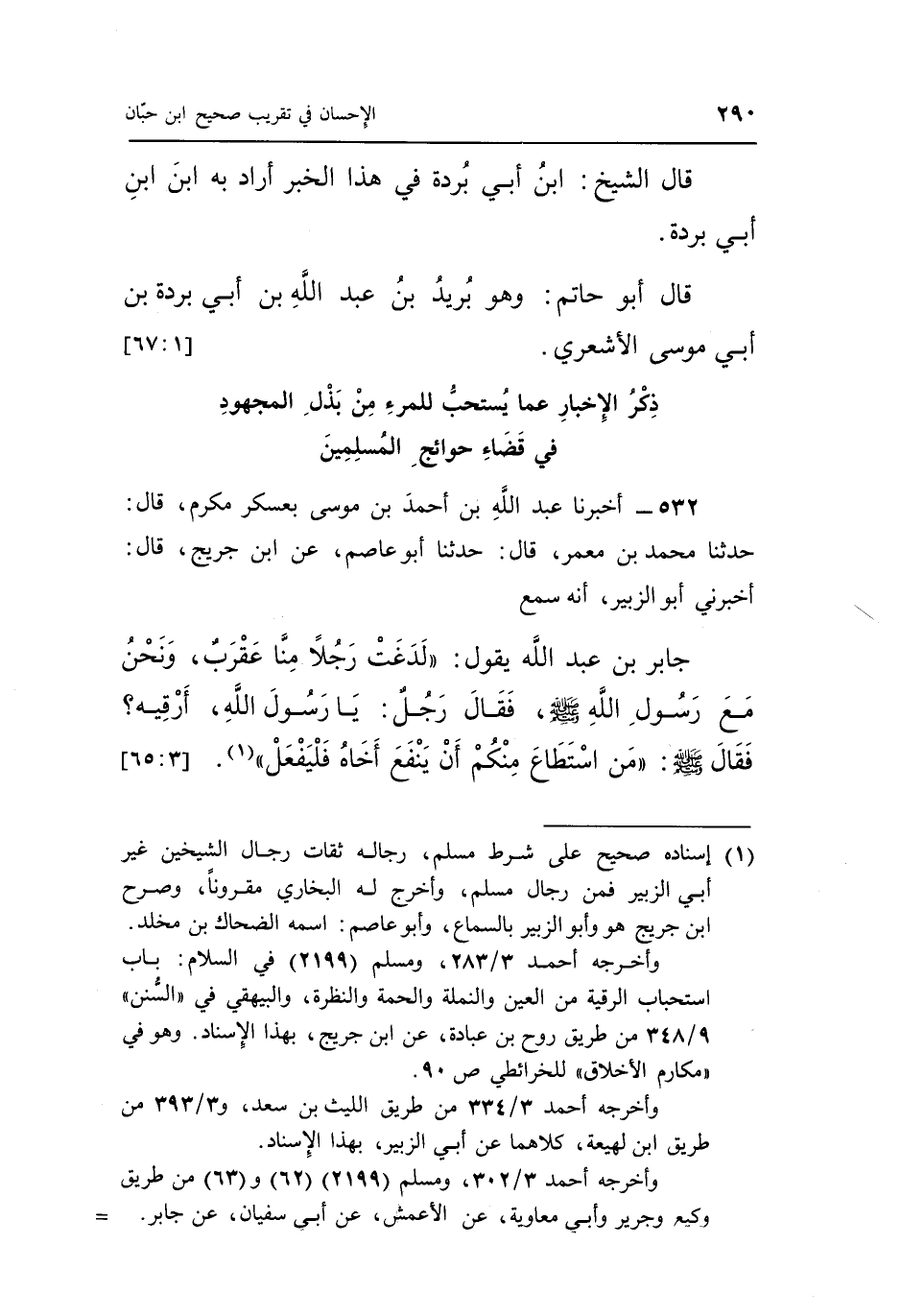 جَابِرَ بْنَ عَبْدِ اللَّهِ يَقُولُ "لَدَغَتْ رَجُلًا مِنَّا عَقْرَبٌ وَنَحْنُ مَعَ رَسُولِ اللَّهِ صَلَّى اللَّهُ عَلَيْهِ وَسَلَّمَ فقَالَ رَجُلٌ يَا رَسُولَ اللَّهِ أَرْقِيهِ فقَالَ صَلَّى اللَّهُ عَلَيْهِ وَسَلَّمَ مَنِ اسْتَطَاعَ مِنْكُمْ أَنْ يَنْفَعَ أَخَاهُ فَلْيَفْعَلْ" 1. [3: 65]