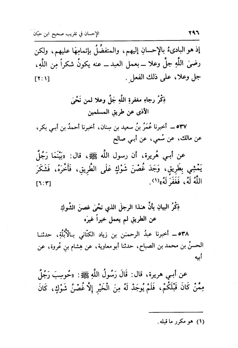 عَنْ أَبِي هُرَيْرَةَ أَنَّ رَسُولَ اللَّهِ صَلَّى اللَّهُ عَلَيْهِ وَسَلَّمَ قَالَ "بَيْنَمَا رَجُلٌ يَمْشِي بِطَرِيقٍ وَجَدَ غُصْنَ شَوْكٍ عَلَى الطَّرِيقِ فَأَخَّرَهُ فَشَكَرَ اللَّهُ لَهُ فَغَفَرَ لَهُ" 1. [3: 6]