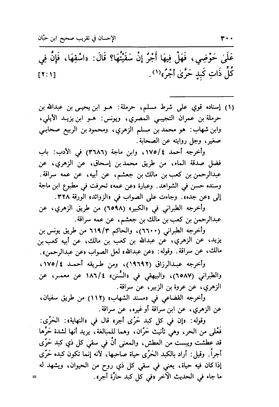 عَلَى حَوْضِي فَهَلْ فِيهَا أَجْرٌ إِنْ سَقَيْتُهَا قَالَ "اسْقِهَا فَإِنَّ فِي كُلِّ ذَاتِ كَبِدٍ حرى أجر" 1. [1: 2]