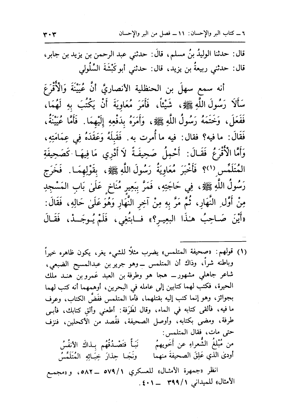 أَنَّهُ سَمِعَ سَهْلَ بْنَ الْحَنْظَلِيَّةِ الْأَنْصَارِيَّ أَنَّ عُيَيْنَةَ وَالْأَقْرَعَ سَأَلَا رَسُولَ اللَّهِ صَلَّى اللَّهُ عَلَيْهِ وَسَلَّمَ شَيْئًا فَأَمَرَ مُعَاوِيَةَ أَنْ يَكْتُبَ بِهِ لَهُمَا فَفَعَلَ وَخَتَمَهُ رَسُولُ اللَّهِ صَلَّى اللَّهُ عَلَيْهِ وَسَلَّمَ وَأَمَرَهُ بِدَفْعِهِ إِلَيْهِمَا فَأَمَّا عُيَيْنَةُ فقَالَ مَا فِيهِ فقَالَ فِيهِ مَا أُمِرْتُ بِهِ فَقَبَّلَهُ وَعَقَدَهُ فِي عِمَامَتِهِ وَأَمَّا الْأَقْرَعُ فقَالَ أَحْمِلُ صَحِيفَةً لَا أَدْرِي مَا فِيهَا كَصَحِيفَةِ الْمُتَلَمِّسِ1 فَأَخْبَرَ مُعَاوِيَةُ رَسُولَ اللَّهِ صَلَّى اللَّهُ عَلَيْهِ وَسَلَّمَ بِقَوْلِهِمَا فَخَرَجَ رَسُولُ اللَّهِ صَلَّى اللَّهُ عَلَيْهِ وَسَلَّمَ في حاجته فمر ببعير مناخ على الباب الْمَسْجِدِ مِنْ أَوَّلِ النَّهَارِ ثُمَّ مَرَّ بِهِ مِنْ آخِرِ النَّهَارِ وَهُوَ عَلَى حَالِهِ فقَالَ "أَيْنَ صَاحِبُ هَذَا الْبَعِيرِ" فَابْتُغِيَ فَلَمْ يُوجَدْ فقال