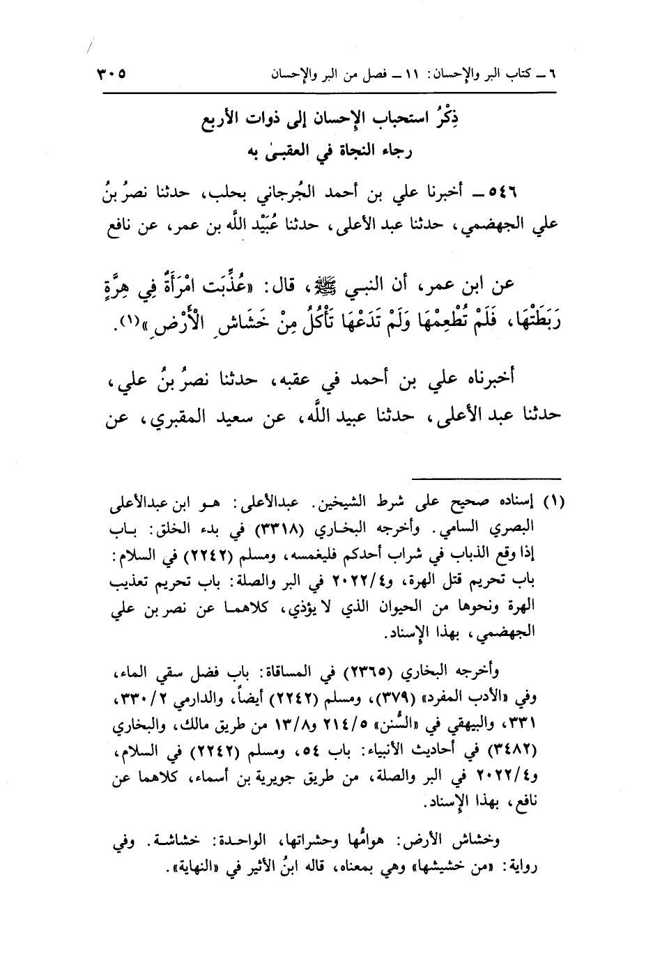 ذِكْرُ اسْتِحْبَابِ الْإِحْسَانِ إِلَى ذَوَاتِ الْأَرْبَعِ رَجَاءَ النَّجَاةِ فِي الْعُقْبَى بِهِ