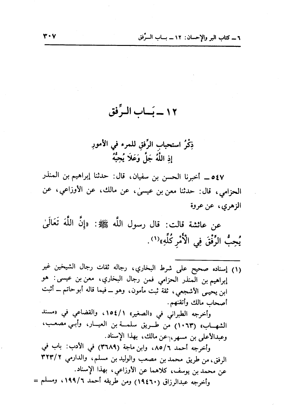 عَنْ عَائِشَةَ قَالَتْ قَالَ رَسُولُ اللَّهِ صَلَّى اللَّهُ عَلَيْهِ وَسَلَّمَ "إِنَّ اللَّهَ تَعَالَى يحب الرفق في الأمر كله" 1.