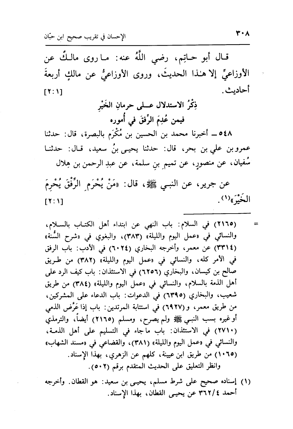عن جرير عم النَّبِيِّ صَلَّى اللَّهُ عَلَيْهِ وَسَلَّمَ قَالَ "مَنْ يحرم الرفق يحرم الخير" 1. [1: 2]