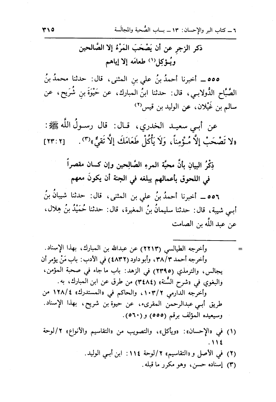 عَنْ أَبِي سَعِيدٍ الْخُدْرِيِّ قَالَ قَالَ رَسُولُ اللَّهِ صَلَّى اللَّهُ عَلَيْهِ وَسَلَّمَ "لَا تَصْحَبْ إِلَّا مؤمنا ولا يأكل طعامك إلا تقي" 3.] 2: 23]