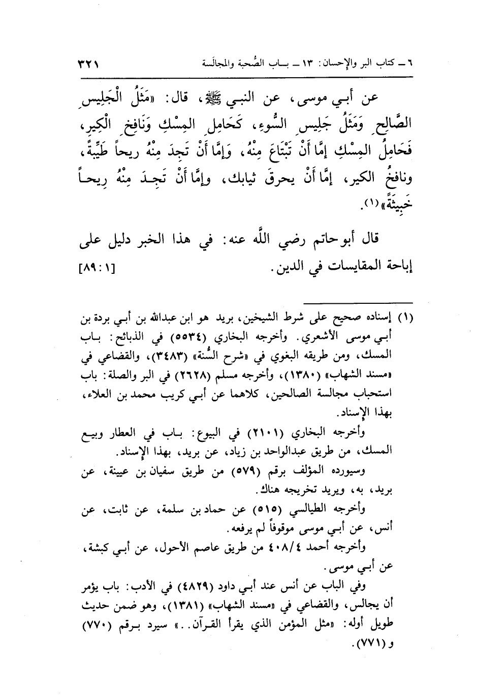 عَنْ أَبِي مُوسَى عَنِ النَّبِيِّ صَلَّى اللَّهُ عَلَيْهِ وَسَلَّمَ قَالَ "مَثَلُ الْجَلِيسِ الصَّالِحِ وَمَثَلُ جَلِيسِ السُّوءِ كَحَامِلِ الْمِسْكِ وَنَافِخِ الْكِيرِ فَحَامِلُ الْمِسْكِ إِمَّا أَنْ تَبْتَاعَ مِنْهُ وَإِمَّا أَنْ تَجِدَ مِنْهُ رِيحًا طَيِّبَةً وَنَافِخُ الْكِيرِ إِمَّا أَنْ يُحْرِقَ ثِيَابَكَ وَإِمَّا أَنْ تَجِدَ مِنْهُ رِيحًا خَبِيثَةً" 1.