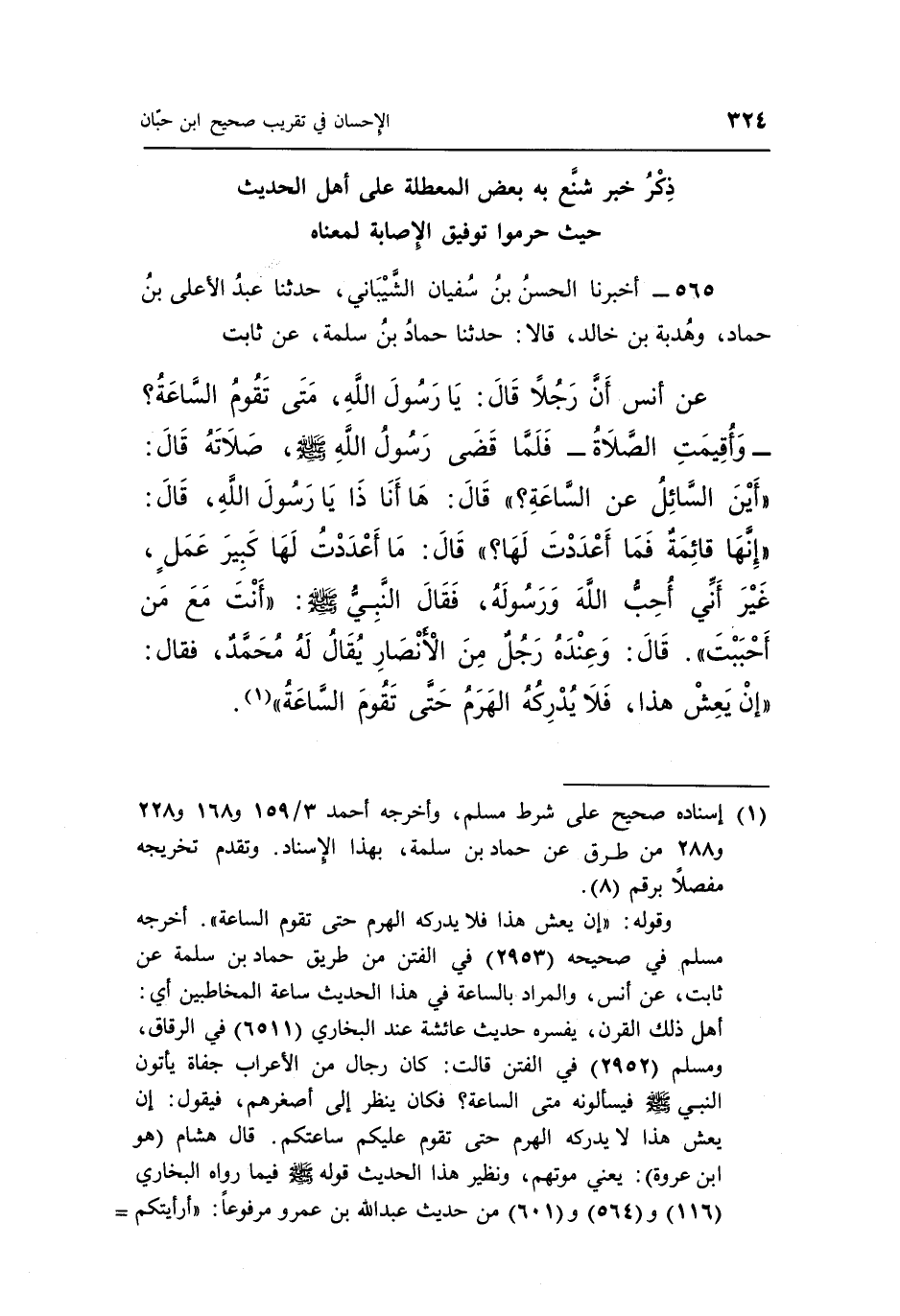 565 - أَخْبَرَنَا الْحَسَنُ بْنُ سُفْيَانَ الشَّيْبَانِيُّ، حَدَّثَنَا عَبْدُ الْأَعْلَى بْنُ حَمَّادٍ، وَهُدْبَةُ بْنُ خَالِدٍ، قَالَا: حَدَّثَنَا حَمَّادُ بْنُ سَلَمَةَ، عَنْ ثَابِتٍ، عَنْ أَنَسٍ: أَنَّ رَجُلًا قَالَ: يَا رَسُولَ اللَّهِ مَتَى تَقُومُ السَّاعَةُ؟ وَأُقِيمَتِ الصَّلَاةُ فَلَمَّا قَضَى رَسُولُ اللَّهِ صَلَّى اللَّهُ عَلَيْهِ وَسَلَّمَ صَلَاتَهُ، قَالَ: «أَيْنَ السَّائِلُ عَنِ السَّاعَةِ؟ » قَالَ: هَا أَنَا ذَا يَا رَسُولَ اللَّهِ، قَالَ: «إِنَّهَا قَائِمَةٌ فَمَا أَعْدَدْتَ لَهَا؟ »، قَالَ: مَا أَعْدَدْتُ لَهَا كَبِيرَ عَمَلٍ غَيْرَ أَنِّي أُحِبُّ اللَّهَ وَرَسُولَهُ، فقَالَ النَّبِيُّ صَلَّى اللَّهُ عَلَيْهِ وَسَلَّمَ: § «أَنْتَ مَعَ مَنْ أَحْبَبْتَ»، قَالَ: وَعِنْدَهُ رَجُلٌ مِنَ الْأَنْصَارِ يُقَالُ لَهُ مُحَمَّدٌ، فقَالَ: «إِنْ يَعِشْ هَذَا، فَلَا يُدْرِكُهُ الْهَرَمُ حَتَّى تَقُومَ السَّاعَةُ»