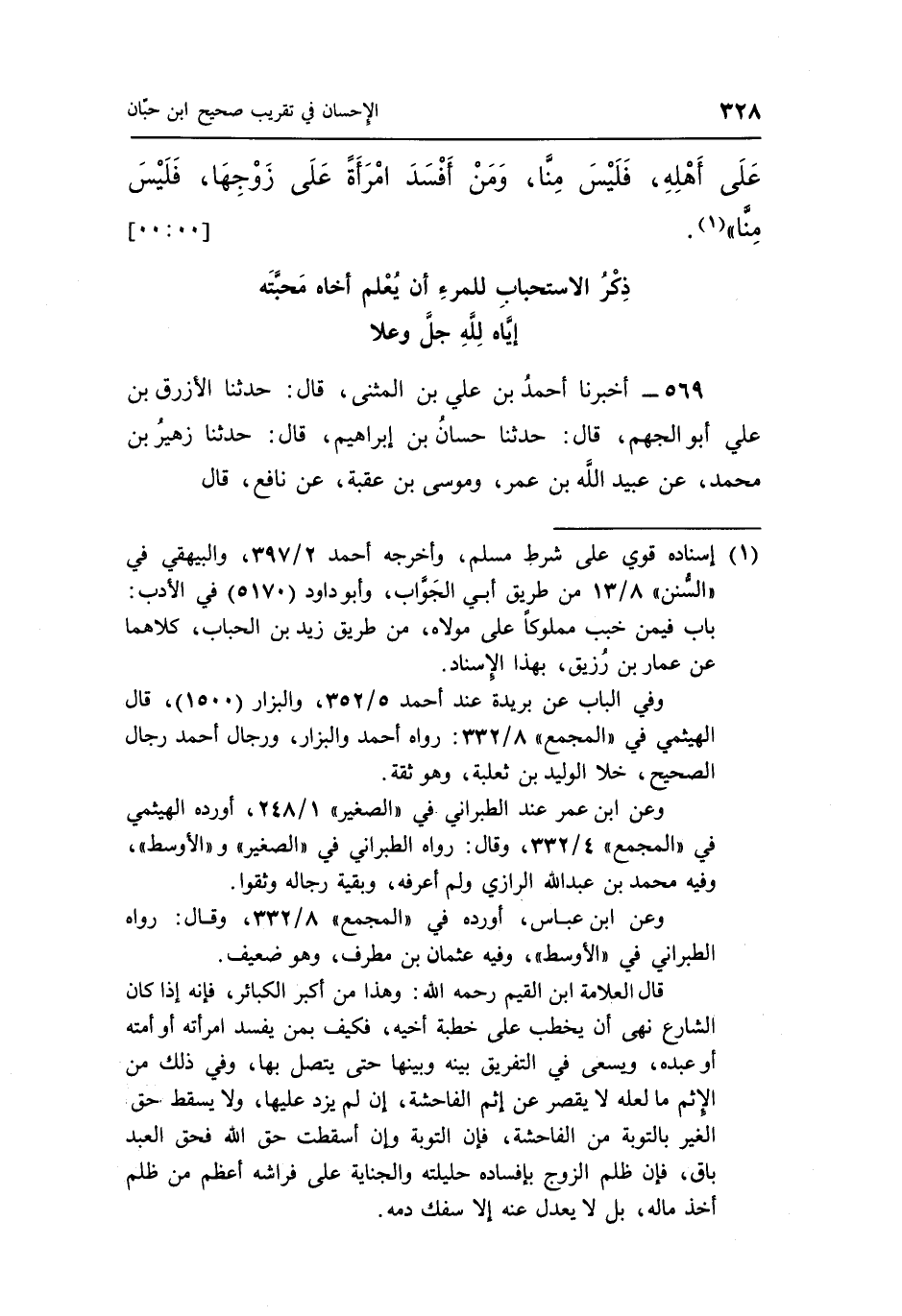 569 - أَخْبَرَنَا أَحْمَدُ بْنُ عَلِيِّ بْنِ الْمُثَنَّى، قَالَ: حَدَّثَنَا الْأَزْرَقُ بْنُ عَلِيٍّ أَبُو الْجَهْمِ، قَالَ: حَدَّثَنَا حَسَّانُ بْنُ إِبْرَاهِيمَ، قَالَ: حَدَّثَنَا زُهَيْرُ بْنُ مُحَمَّدٍ، عَنْ عُبَيْدِ اللَّهِ بْنِ عُمَرَ، وَمُوسَى بْنِ عُقْبَةَ، عَنْ نَافِعٍ، قَالَ: -[329]- سَمِعْتُ ابْنَ عُمَرَ، يَقُولُ: بَيْنَا أَنَا جَالِسٌ عِنْدَ النَّبِيِّ صَلَّى اللَّهُ عَلَيْهِ وَسَلَّمَ إِذْ أَتَاهُ رَجُلٌ فَسَلَّمَ عَلَيْهِ، ثُمَّ وَلَّى عَنْهُ، فَقُلْتُ: يَا رَسُولَ اللَّهِ إِنِّي لَأُحِبُّ هَذَا لِلَّهِ، قَالَ: § «فَهَلْ أَعْلَمْتَهُ ذَاكَ؟ » قُلْتُ: لَا، قَالَ: «فَأَعْلِمْ ذَاكَ أَخَاكَ»، قَالَ: فَاتَّبَعْتُهُ فَأَدْرَكْتُهُ فَأَخَذْتُ بِمَنْكِبِهِ فَسَلَّمْتُ عَلَيْهِ، وَقُلْتُ: وَاللَّهِ إِنِّي لَأُحِبُّكَ لِلَّهِ، قَالَ هُوَ: وَاللَّهِ إِنِّي لَأُحِبُّكَ لِلَّهِ قُلْتُ: لَوْلَا النَّبِيُّ صَلَّى اللَّهُ عَلَيْهِ وَسَلَّمَ، أَمَرَنِي أَنْ أُعْلِمُكَ لَمْ أَفْعَلْ.