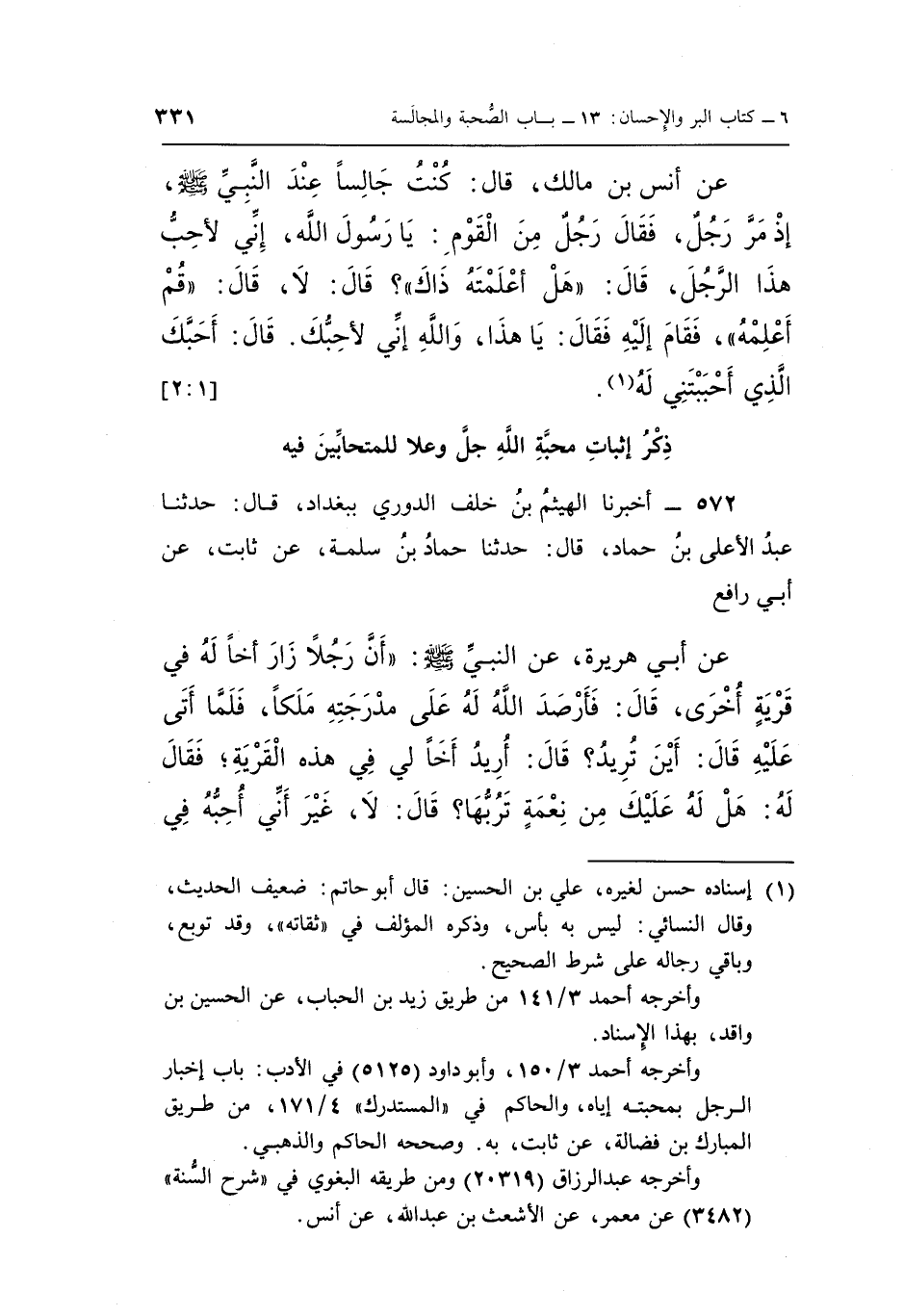 572 - أَخْبَرَنَا الْهَيْثَمُ بْنُ خَلَفٍ الدُّورِيُّ بِبَغْدَادَ، قَالَ: حَدَّثَنَا عَبْدُ الْأَعْلَى بْنُ حَمَّادٍ، قَالَ: حَدَّثَنَا حَمَّادُ بْنُ سَلَمَةَ، عَنْ ثَابِتٍ، عَنْ أَبِي رَافِعٍ، عَنْ أَبِي هُرَيْرَةَ، عَنِ النَّبِيِّ صَلَّى اللَّهُ عَلَيْهِ وَسَلَّمَ: «أَنَّ رَجُلًا زَارَ أَخًا لَهُ فِي قَرْيَةٍ أُخْرَى، قَالَ: فَأَرْصَدَ اللَّهُ لَهُ عَلَى مَدْرَجَتِهِ مَلَكًا، فَلَمَّا أَتَى عَلَيْهِ، قَالَ: أَيْنَ تُرِيدُ؟، قَالَ: أُرِيدُ أَخًا لِي فِي هَذِهِ الْقَرْيَةِ، فقَالَ لَهُ: هَلْ لَهُ عَلَيْكَ مِنْ نِعْمَةٍ تَرُبُّهَا؟، قَالَ: لَا، غَيْرَ أَنِّي أُحِبُّهُ فِي -[332]- اللَّهِ، قَالَ: §فَإِنِّي رَسُولُ اللَّهِ إِلَيْكَ، إِنَّ اللَّهَ جَلَّ وَعَلَا قَدْ أَحَبَّكَ كَمَا أَحْبَبْتَهُ فِيهِ».