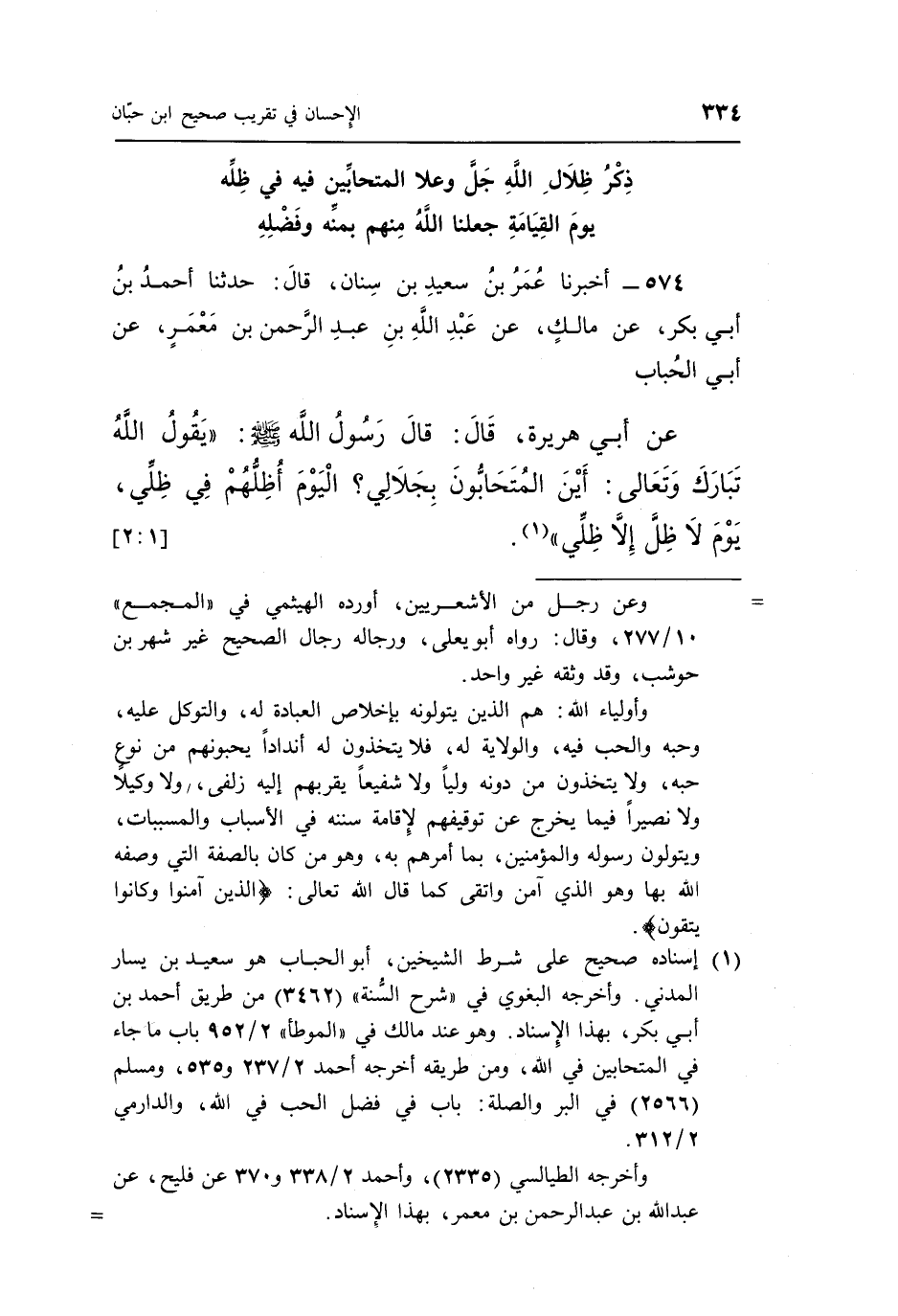 574 - أَخْبَرَنَا عُمَرُ بْنُ سَعِيدِ بْنِ سِنَانٍ، قَالَ: حَدَّثَنَا أَحْمَدُ بْنُ أَبِي بَكْرٍ، عَنْ مَالِكٍ، عَنْ عَبْدِ اللَّهِ بْنِ عَبْدِ الرَّحْمَنِ بْنِ مَعْمَرٍ، عَنْ أَبِي الْحُبَابِ، عَنْ أَبِي هُرَيْرَةَ، قَالَ: قَالَ رَسُولُ اللَّهِ صَلَّى اللَّهُ عَلَيْهِ وَسَلَّمَ: «يَقُولُ اللَّهُ تَبَارَكَ وَتَعَالَى: §أَيْنَ الْمُتَحَابُّونَ بِجَلَالِي؟ الْيَوْمَ أُظِلُّهُمْ فِي ظِلِّي، يَوْمَ لَا ظِلَّ إِلَّا ظِلِّي».
