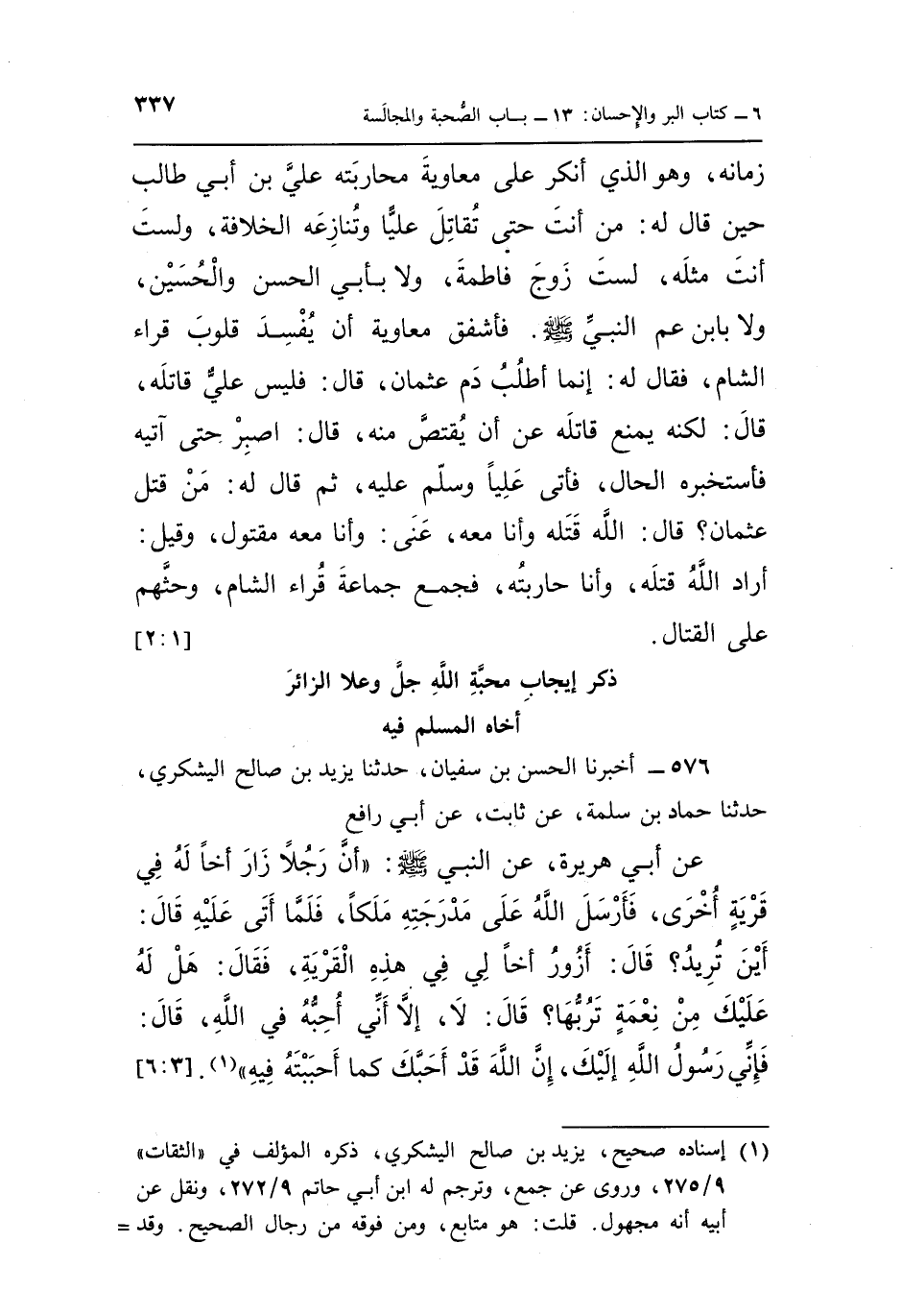 576 - أَخْبَرَنَا الْحَسَنُ بْنُ سُفْيَانَ، حَدَّثَنَا يَزِيدُ بْنُ صَالِحٍ الْيَشْكُرِيُّ، حَدَّثَنَا حَمَّادُ بْنُ سَلَمَةَ، عَنْ ثَابِتٍ، عَنْ أَبِي رَافِعٍ، عَنْ أَبِي هُرَيْرَةَ، عَنِ النَّبِيِّ صَلَّى اللَّهُ عَلَيْهِ وَسَلَّمَ: «أَنَّ رَجُلًا زَارَ أَخًا لَهُ فِي قَرْيَةٍ أُخْرَى، فَأَرْسَلَ اللَّهُ عَلَى مَدْرَجَتِهِ مَلَكًا، فَلَمَّا أَتَى عَلَيْهِ، قَالَ: أَيْنَ تُرِيدُ؟، قَالَ: أَزُورُ أَخًا لِي فِي هَذِهِ الْقَرْيَةِ، فقَالَ: هَلْ لَهُ عَلَيْكَ مِنْ نِعْمَةٍ تَرُبُّهَا؟، قَالَ: لَا، إِلَّا أَنِّي أُحِبُّهُ فِي اللَّهِ، قَالَ: §فَإِنِّي رَسُولُ اللَّهِ إِلَيْكَ، إِنَّ اللَّهَ قَدْ أَحَبَّكَ كَمَا أَحْبَبْتَهُ فِيهِ».