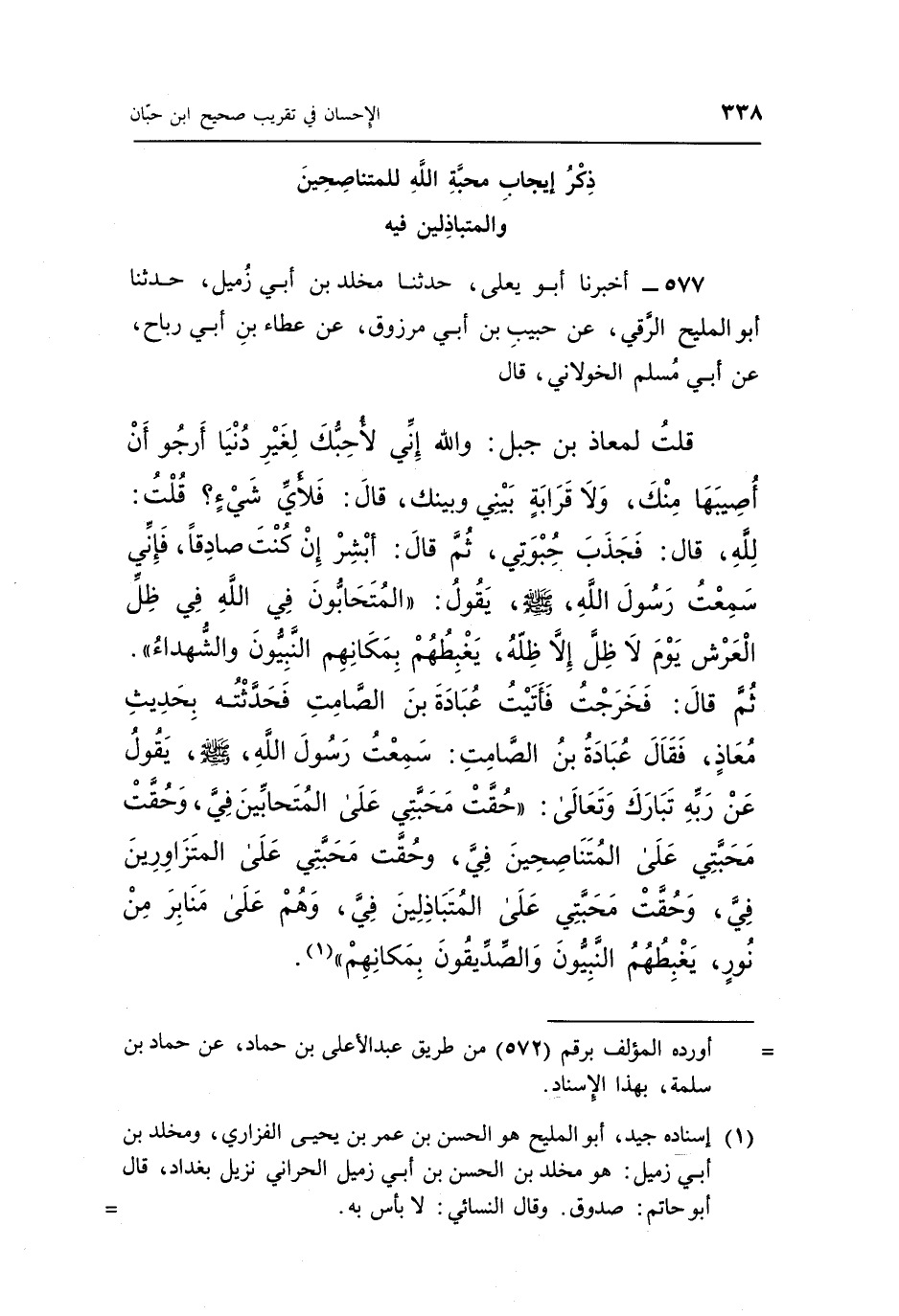 577 - أَخْبَرَنَا أَبُو يَعْلَى، حَدَّثَنَا مَخْلَدُ بْنُ أَبِي زُمَيْلٍ، حَدَّثَنَا أَبُو الْمَلِيحِ الرَّقِّيُّ، عَنْ حَبِيبِ بْنِ أَبِي مَرْزُوقٍ، عَنْ عَطَاءِ بْنِ أَبِي رَبَاحٍ، عَنْ أَبِي مُسْلِمٍ الْخَوْلَانِيِّ، قَالَ: قُلْتُ لِمُعَاذِ بْنِ جَبَلٍ: وَاللَّهِ إِنِّي لَأُحِبُّكَ لِغَيْرِ دُنْيَا أَرْجُو أَنْ أُصِيبَهَا مِنْكَ، وَلَا قَرَابَةَ بَيْنِي وَبَيْنَكَ، قَالَ: فَلِأَيِّ شَيْءٍ؟ قُلْتُ: لِلَّهِ، قَالَ: فَجَذَبَ حُبْوَتِي، ثُمَّ قَالَ: أَبْشِرْ إِنْ كُنْتَ صَادِقًا، فَإِنِّي سَمِعْتُ رَسُولَ اللَّهِ صَلَّى اللَّهُ عَلَيْهِ وَسَلَّمَ، يَقُولُ: § «الْمُتَحَابُّونَ فِي اللَّهِ فِي ظِلِّ الْعَرْشِ يَوْمَ لَا ظِلَّ إِلَّا ظِلُّهُ، يَغْبِطُهُمْ بِمَكَانِهِمِ النَّبِيُّونَ وَالشُّهَدَاءُ» ثُمَّ، قَالَ: فَخَرَجْتُ فَأَتَيْتُ عُبَادَةَ بْنَ الصَّامِتِ، فَحَدَّثْتُهُ بِحَدِيثِ مُعَاذٍ، فقَالَ عُبَادَةُ بْنُ الصَّامِتِ: سَمِعْتُ رَسُولَ اللَّهِ صَلَّى اللَّهُ عَلَيْهِ وَسَلَّمَ يَقُولُ عَنْ رَبِّهِ تَبَارَكَ وَتَعَالَى: «حُقَّتْ مَحَبَّتِي عَلَى الْمُتَحَابِّينَ فِيَّ، وَحُقَّتْ مَحَبَّتِي عَلَى الْمُتَنَاصِحِينَ فِيَّ، وَحُقَّتْ مَحَبَّتِي عَلَى الْمُتَزَاوِرِينَ فِيَّ، وَحُقَّتْ مَحَبَّتِي عَلَى الْمُتَبَاذِلِينَ فِيَّ، وَهُمْ عَلَى مَنَابِرَ مِنْ نُورٍ، يَغْبِطُهُمُ النَّبِيُّونَ وَالصِّدِّيقُونَ بِمَكَانِهِمْ»