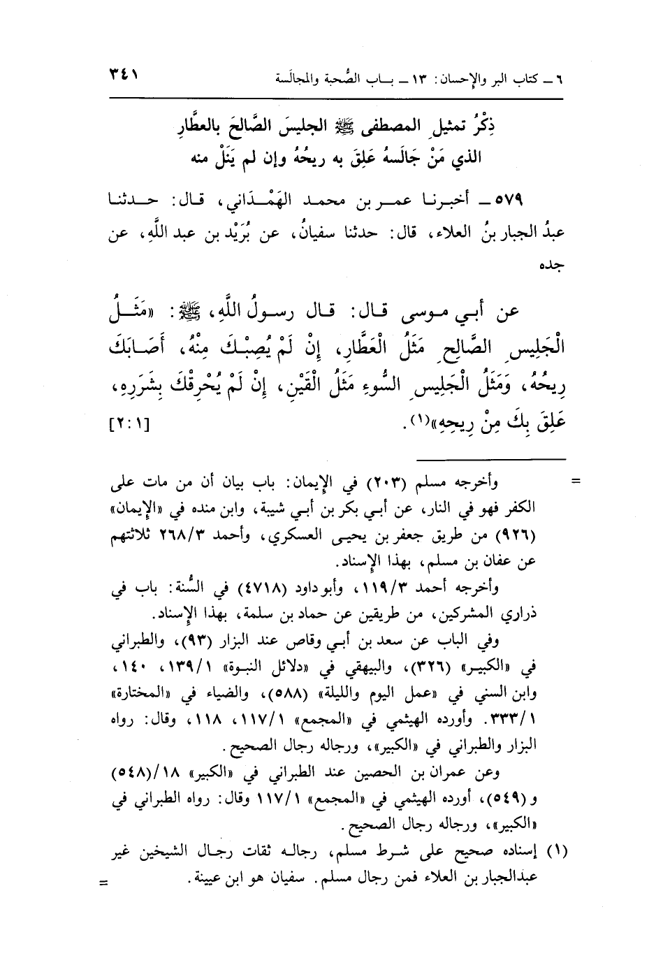 579 - أَخْبَرَنَا عُمَرُ بْنُ مُحَمَّدٍ الْهَمْدَانِيُّ، قَالَ: حَدَّثَنَا عَبْدُ الْجَبَّارِ بْنُ الْعَلَاءِ، قَالَ: حَدَّثَنَا سُفْيَانُ، عَنْ بُرَيْدِ بْنِ عَبْدِ اللَّهِ، عَنْ جَدِّهِ، عَنْ أَبِي مُوسَى، قَالَ: قَالَ رَسُولُ اللَّهِ صَلَّى اللَّهُ عَلَيْهِ وَسَلَّمَ: § «مَثَلُ الْجَلِيسِ الصَّالِحِ مَثَلُ الْعَطَّارِ، إِنْ لَمْ يُصِبْكَ مِنْهُ، أَصَابَكَ رِيحُهُ، وَمَثَلُ الْجَلِيسِ السُّوءِ مَثَلُ الْقَيْنِ، إِنْ لَمْ يُحْرِقْكَ بِشَرَرِهِ، عَلِقَ بِكَ مِنْ رِيحِهِ».