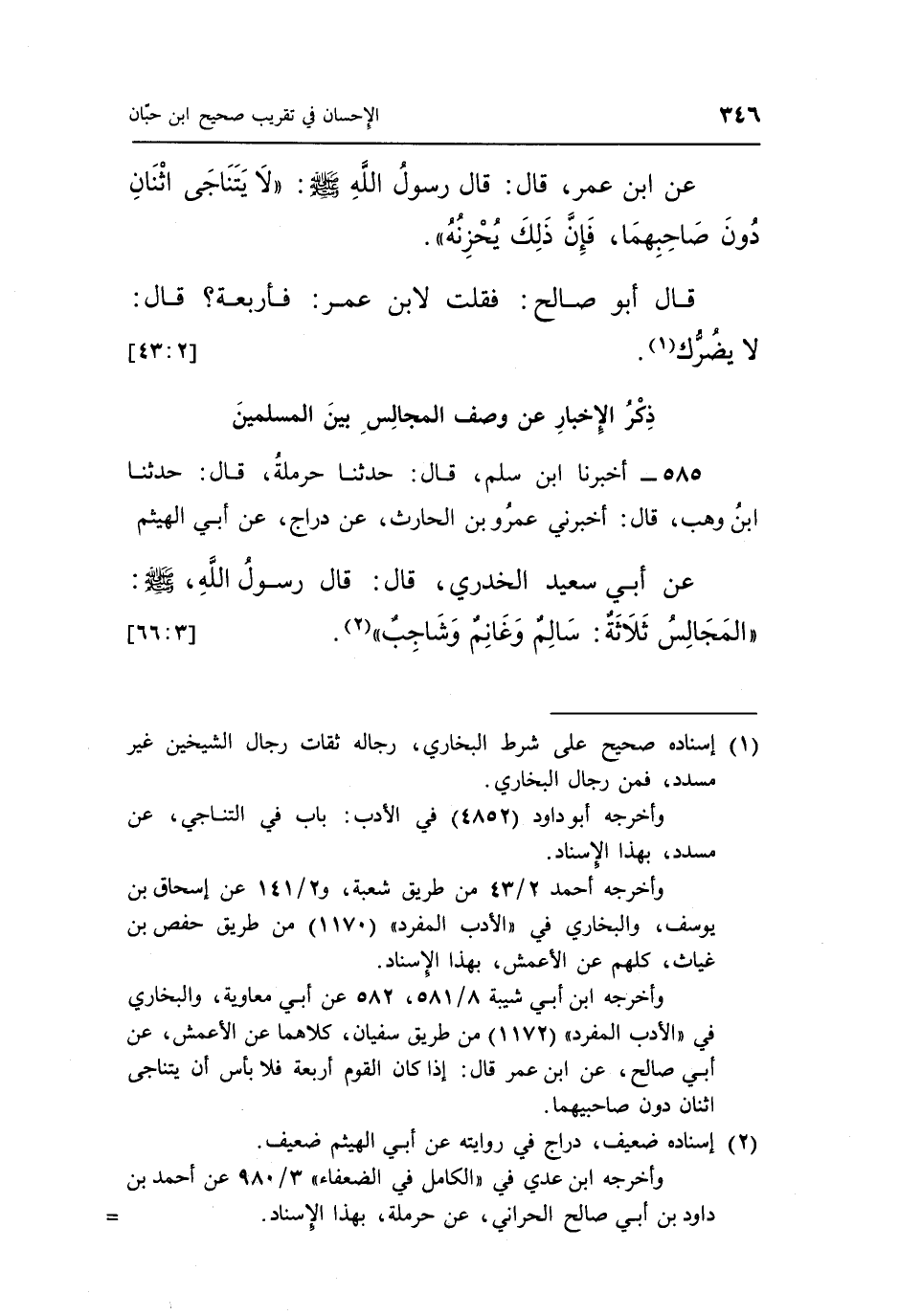585 - أَخْبَرَنَا ابْنُ سَلْمٍ، قَالَ: حَدَّثَنَا حَرْمَلَةُ، قَالَ: حَدَّثَنَا ابْنُ وَهْبٍ، قَالَ: أَخْبَرَنِي عَمْرُو بْنُ الْحَارِثِ، عَنْ دَرَّاجٍ، عَنْ أَبِي الْهَيْثَمِ، عَنْ أَبِي سَعِيدٍ الْخُدْرِيِّ، قَالَ: قَالَ رَسُولُ اللَّهِ صَلَّى اللَّهُ عَلَيْهِ وَسَلَّمَ: § «الْمَجَالِسُ ثَلَاثَةٌ: سَالِمٌ، وَغَانِمٌ، وَشَاجِبٌ» [3: 66]