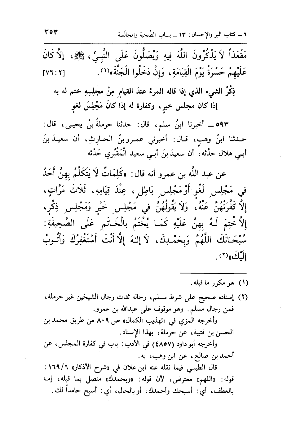 593 - أَخْبَرَنَا ابْنُ سَلْمٍ، قَالَ: حَدَّثَنَا حَرْمَلَةُ بْنُ يَحْيَى، قَالَ: حَدَّثَنَا ابْنُ وَهْبٍ، قَالَ: أَخْبَرَنِي عَمْرُو بْنُ الْحَارِثِ أَنَّ سَعِيدَ بْنَ أَبِي هِلَالٍ، حَدَّثَهُ أَنَّ سَعِيدَ بْنَ أَبِي سَعِيدٍ الْمَقْبُرِيَّ حَدَّثَهُ، عَنْ عَبْدِ اللَّهِ بْنِ عَمْرٍو أَنَّهُ قَالَ: § «كَلِمَاتٌ لَا يَتَكَلَّمُ بِهِنَّ أَحَدٌ فِي مَجْلِسِ لَغْوٍ أَوْ مَجْلِسِ بَاطِلٍ عِنْدَ قِيَامِهِ ثَلَاثَ مَرَّاتٍ إِلَّا كَفَّرَتْهُنَّ عَنْهُ، وَلَا يَقُولُهُنَّ فِي مَجْلِسِ خَيْرٍ وَمَجْلِسِ ذِكْرٍ، إِلَّا خُتِمَ لَهُ بِهِنَّ عَلَيْهِ كَمَا يُخْتَمُ بِالْخَاتَمِ عَلَى الصَّحِيفَةِ: سُبْحَانَكَ اللَّهُمَّ وَبِحَمْدِكَ، لَا إِلَهَ إِلَّا أَنْتَ أَسْتَغْفِرُكَ وَأَتُوبُ إِلَيْكَ»