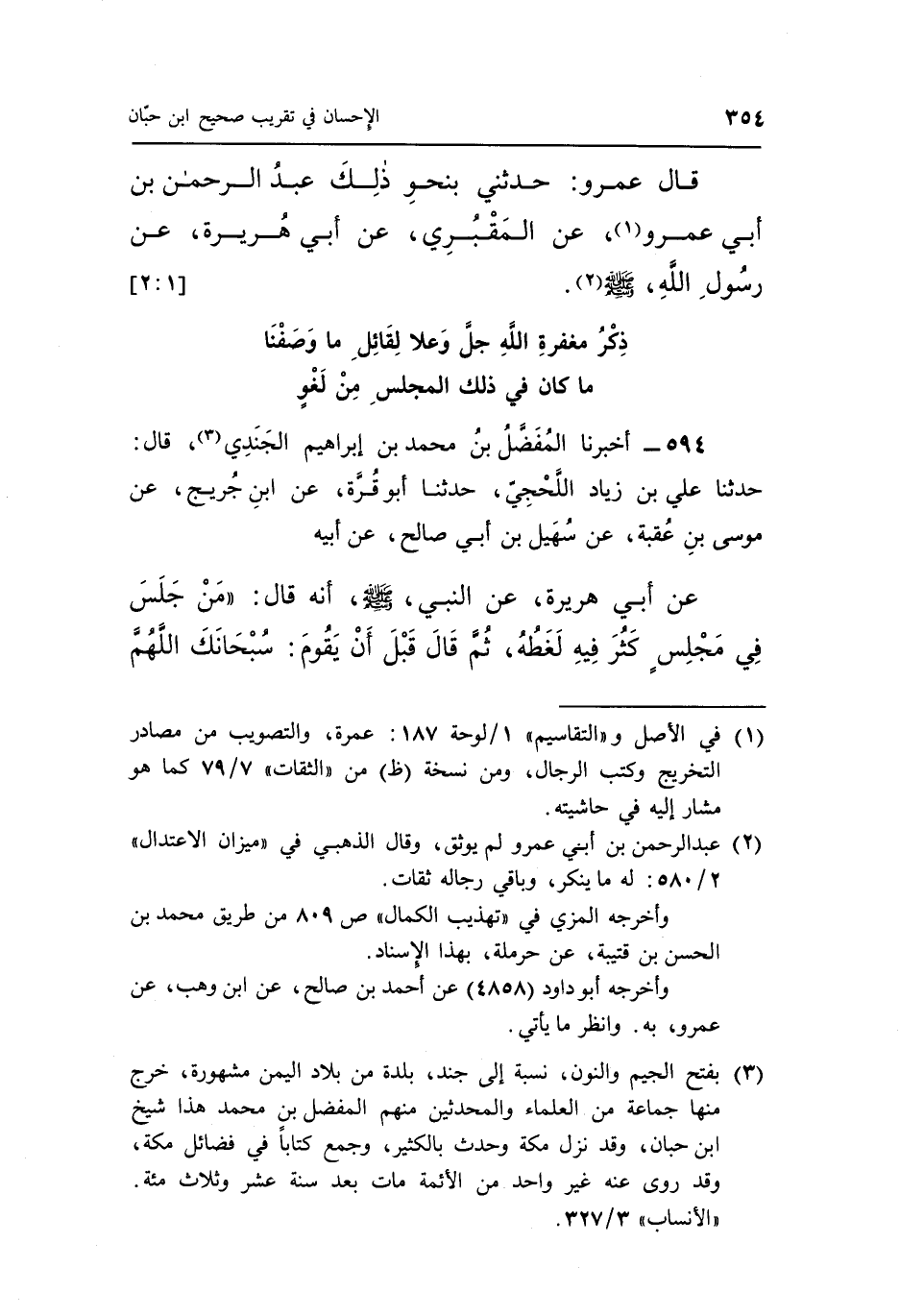 594 - أَخْبَرَنَا الْمُفَضَّلُ بْنُ مُحَمَّدِ بْنِ إِبْرَاهِيمَ الْجَنَدِيُّ، قَالَ: حَدَّثَنَا عَلِيُّ بْنُ زِيَادٍ اللَّحْجِيُّ، حَدَّثَنَا أَبُو قُرَّةَ، عَنِ ابْنِ جُرَيْجٍ، عَنْ مُوسَى بْنِ عُقْبَةَ، عَنْ سُهَيْلِ بْنِ أَبِي صَالِحٍ، عَنْ أَبِيهِ، عَنْ أَبِي هُرَيْرَةَ، عَنِ النَّبِيِّ صَلَّى اللَّهُ عَلَيْهِ وَسَلَّمَ أَنَّهُ قَالَ: § «مَنْ جَلَسَ فِي مَجْلِسٍ كَثُرَ فِيهِ لَغَطُهُ، ثُمَّ قَالَ قَبْلَ أَنْ يَقُومَ: سُبْحَانَكَ اللَّهُمَّ -[355]- رَبَّنَا وَبِحَمْدِكَ، لَا إِلَهَ إِلَّا أَنْتَ، أَسْتَغْفِرُكَ وَأَتُوبُ إِلَيْكَ، إِلَّا غُفِرَ لَهُ مَا كَانَ فِي مَجْلِسِهِ ذَلِكَ».