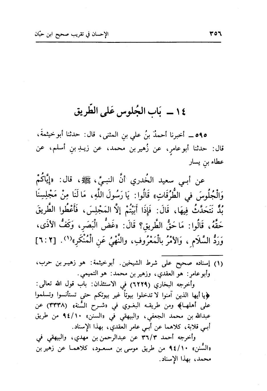 595 - أَخْبَرَنَا أَحْمَدُ بْنُ عَلِيِّ بْنِ الْمُثَنَّى، قَالَ: حَدَّثَنَا أَبُو خَيْثَمَةَ، قَالَ: حَدَّثَنَا أَبُو عَامِرٍ، عَنْ زُهَيْرِ بْنِ مُحَمَّدٍ، عَنْ زَيْدِ بْنِ أَسْلَمَ، عَنْ عَطَاءِ بْنِ يَسَارٍ، عَنْ أَبِي سَعِيدٍ الْخُدْرِيِّ: أَنَّ النَّبِيَّ صَلَّى اللَّهُ عَلَيْهِ وَسَلَّمَ، قَالَ: § «إِيَّاكُمْ وَالْجُلُوسَ فِي الطُّرُقَاتِ»، قَالُوا: يَا رَسُولَ اللَّهِ، مَا لَنَا مِنْ مَجْلِسِنَا بُدٌّ نَتَحَدَّثُ فِيهَا، قَالَ: «فَإِذَا أَبَيْتُمْ إِلَّا الْمَجْلِسَ، فَأَعْطُوا الطَّرِيقَ حَقَّهُ»، قَالُوا: مَا حَقُّ الطَّرِيقِ؟، قَالَ: «غَضُّ الْبَصَرِ، وَكُفُّ الْأَذَى، وَرَدُّ السَّلَامِ، وَالْأَمْرُ بِالْمَعْرُوفِ، وَالنَّهْيُ عَنِ الْمُنْكَرِ» [2: 6]