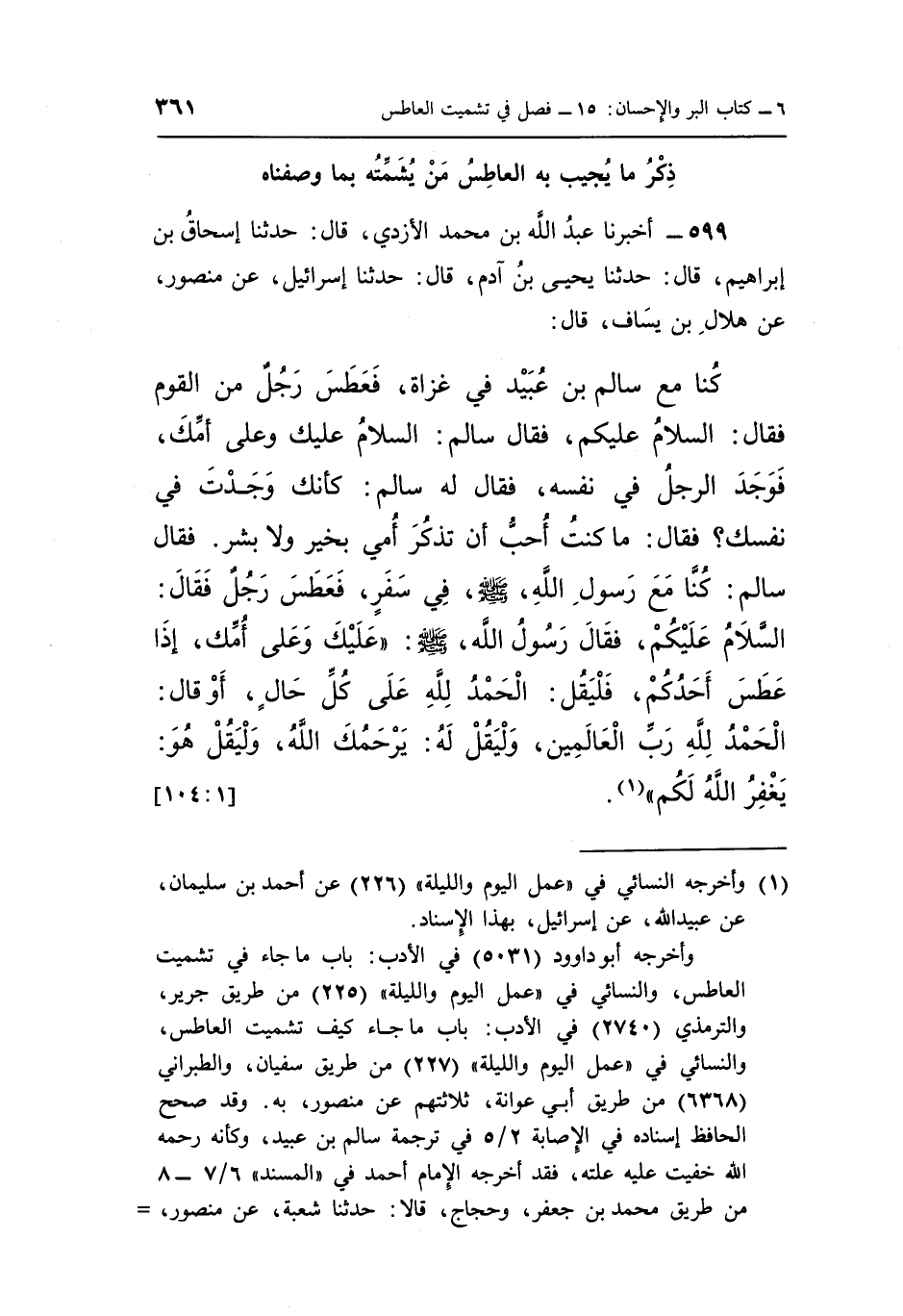 599 - أَخْبَرَنَا عَبْدُ اللَّهِ بْنُ مُحَمَّدٍ الْأَزْدِيُّ، قَالَ: حَدَّثَنَا إِسْحَاقُ بْنُ إِبْرَاهِيمَ، قَالَ: حَدَّثَنَا يَحْيَى بْنُ آدَمَ، قَالَ: حَدَّثَنَا إِسْرَائِيلُ، عَنْ مَنْصُورٍ، عَنْ هِلَالِ بْنِ يَسَافٍ، قَالَ: كُنَّا مَعَ سَالِمِ بْنِ عُبَيْدٍ فِي غَزَاةٍ، فَعَطَسَ رَجُلٌ مِنَ الْقَوْمِ، فقَالَ: السَّلَامُ عَلَيْكُمْ، فقَالَ سَالِمٌ: السَّلَامُ عَلَيْكَ وَعَلَى أُمِّكَ، فَوَجَدَ الرَّجُلُ فِي نَفْسِهِ، فقَالَ لَهُ سَالِمٌ: كَأَنَّكَ وَجَدْتَ فِي نَفْسِكَ؟، فقَالَ: مَا كُنْتُ أُحِبُّ أَنْ تَذْكُرَ أُمِّي بِخَيْرٍ وَلَا بِشَرٍّ، فقَالَ سَالِمٌ كُنَّا مَعَ رَسُولِ اللَّهِ صَلَّى اللَّهُ عَلَيْهِ وَسَلَّمَ، فِي سَفَرٍ فَعَطَسَ رَجُلٌ، فقَالَ: السَّلَامُ عَلَيْكُمْ، فقَالَ رَسُولُ اللَّهِ صَلَّى اللَّهُ عَلَيْهِ وَسَلَّمَ: § «عَلَيْكَ وَعَلَى أُمِّكَ، إِذَا عَطَسَ أَحَدُكُمْ فَلْيَقُلِ: الْحَمْدُ لِلَّهِ عَلَى كُلِّ حَالٍ، أَوْ، قَالَ: الْحَمْدُ لِلَّهِ رَبِّ الْعَالَمِينَ، وَلْيَقُلْ لَهُ: يَرْحَمُكَ اللَّهُ، وَلْيَقُلْ هُوَ: يَغْفِرُ اللَّهُ لَكُمْ».