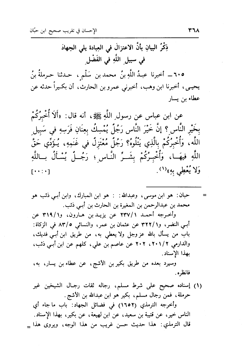 605 - أَخْبَرَنَا عَبْدُ اللَّهِ بْنُ مُحَمَّدِ بْنِ سَلْمٍ، حَدَّثَنَا حَرْمَلَةُ بْنُ يَحْيَى، أَخْبَرَنَا ابْنُ وَهْبٍ، أَخْبَرَنِي عَمْرُو بْنُ الْحَارِثِ أَنَّ بُكَيْرًا، حَدَّثَهُ عَنْ عَطَاءِ بْنِ يَسَارٍ، عَنِ ابْنِ عَبَّاسٍ، عَنْ رَسُولِ اللَّهِ صَلَّى اللَّهُ عَلَيْهِ وَسَلَّمَ أَنَّهُ قَالَ: § «أَلَا أُخْبِرُكُمْ بِخَيْرِ النَّاسِ؟ إِنَّ خَيْرَ النَّاسِ رَجُلٌ يُمْسِكُ بِعِنَانِ فَرَسِهِ فِي سَبِيلِ اللَّهِ، وَأُخْبِرُكُمْ بِالَّذِي يَتْلُوهُ؟ رَجُلٌ مُعْتَزِلٌ فِي غَنَمِهِ، يُؤَدِّي حَقَّ اللَّهِ فِيهَا، وَأُخْبِرُكُمْ بِشَرِّ النَّاسِ، رَجُلٌ يُسْأَلُ بِاللَّهِ وَلَا يُعْطِي بِهِ».