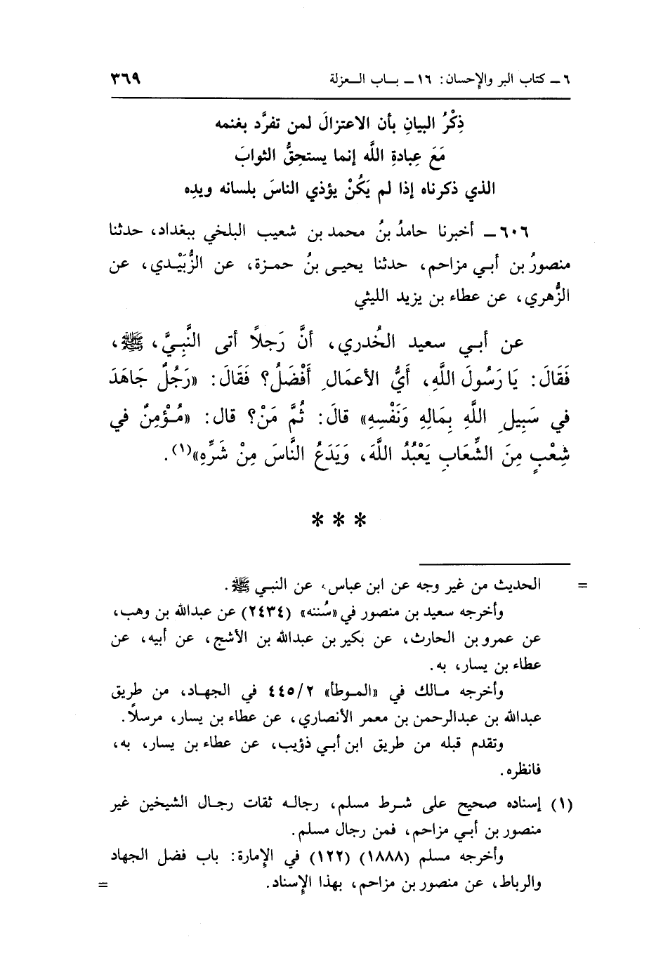 606 - أَخْبَرَنَا حَامِدُ بْنُ مُحَمَّدِ بْنِ شُعَيْبٍ الْبَلْخِيُّ بِبَغْدَادَ، حَدَّثَنَا مَنْصُورُ بْنُ أَبِي مُزَاحِمٍ، حَدَّثَنَا يَحْيَى بْنُ حَمْزَةَ، عَنِ الزُّبَيْدِيِّ، عَنِ الزُّهْرِيِّ، عَنْ عَطَاءِ بْنِ يَزِيدَ اللَّيْثِيِّ، عَنْ أَبِي سَعِيدٍ الْخُدْرِيِّ: أَنَّ رَجُلًا أَتَى النَّبِيَّ صَلَّى اللَّهُ عَلَيْهِ وَسَلَّمَ، فقَالَ: يَا رَسُولَ اللَّهِ، أَيُّ الأَعْمَالِ* أَفْضَلُ؟، فقَالَ: § «رَجُلٌ جَاهَدَ فِي سَبِيلِ اللَّهِ بِمَالِهِ وَنَفْسِهِ»، قَالَ: ثُمَّ مَنْ؟، قَالَ: «مُؤْمِنٌ فِي شِعْبٍ [مِنَ] * الشِّعَابِ يَعْبُدُ اللَّهَ، وَيَدَعُ النَّاسَ مِنْ شَرِّهِ»