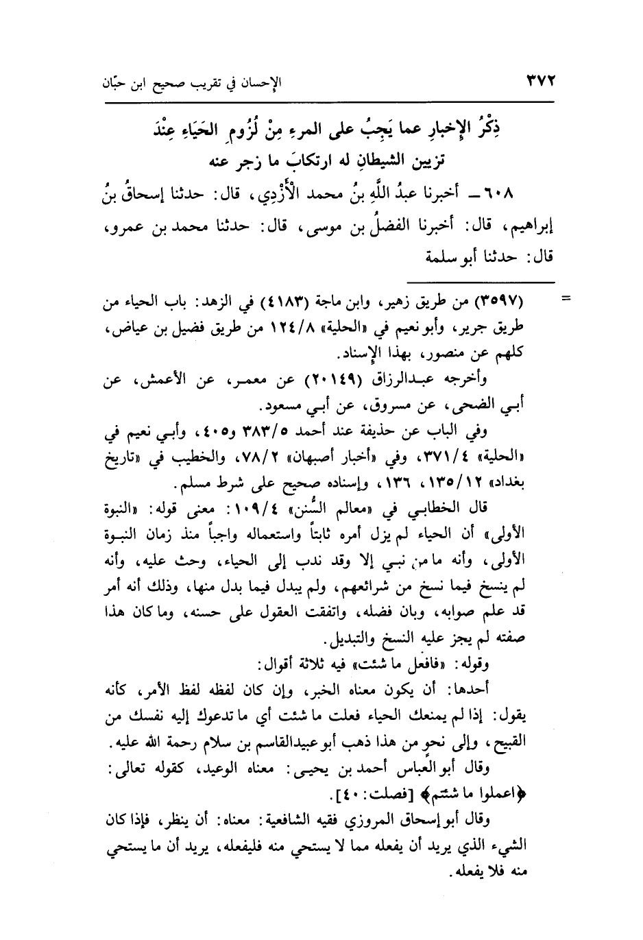 608 - أَخْبَرَنَا عَبْدُ اللَّهِ بْنُ مُحَمَّدٍ الْأَزْدِيُّ قَالَ حَدَّثَنَا إِسْحَاقُ بْنُ إِبْرَاهِيمَ قَالَ أَخْبَرَنَا الْفَضْلُ بْنُ مُوسَى قَالَ حَدَّثَنَا مُحَمَّدُ بْنُ عَمْرٍو قَالَ حَدَّثَنَا أبو سلمةذكر الْإِخْبَارِ عَمَّا يَجِبُ عَلَى الْمَرْءِ مِنْ لُزُومِ الْحَيَاءِ عِنْدَ تَزْيِينِ الشَّيْطَانِ لَهُ ارْتِكَابَ مَا زُجِرَ عَنْهُ