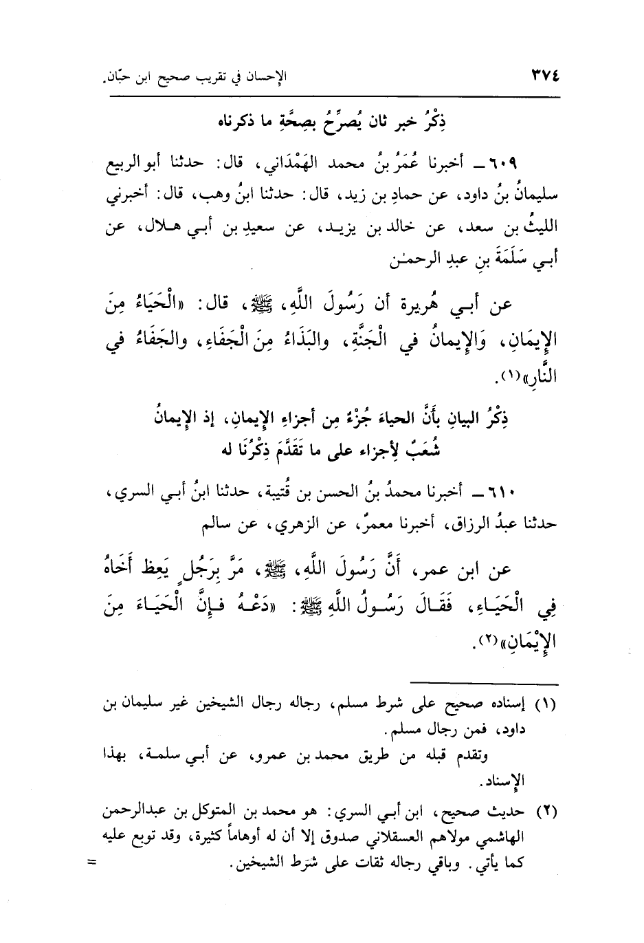 609 - أَخْبَرَنَا عُمَرُ بْنُ مُحَمَّدٍ الْهَمْدَانِيُّ قَالَ حَدَّثَنَا أَبُو الرَّبِيعِ سُلَيْمَانُ بْنُ دَاوُدَ عَنْ حَمَّادِ بن زيد قال حدثنا بن وَهْبٍ قَالَ أَخْبَرَنِي اللَّيْثُ بْنُ سَعْدٍ عَنْ خَالِدِ بْنِ يَزِيدَ عَنْ سَعِيدِ بْنِ أَبِي هِلَالٍ عَنْ أَبِي سَلَمَةَ بْنِ عَبْدِ الرَّحْمَنِ عَنْ أَبِي هُرَيْرَةَ أَنَّ رَسُولَ اللَّهِ صَلَّى اللَّهُ عَلَيْهِ وَسَلَّمَ قَالَ "الْحَيَاءُ مِنَ الْإِيمَانِ وَالْإِيمَانُ فِي الْجَنَّةِ وَالْبَذَاءُ مِنَ الْجَفَاءِ وَالْجَفَاءُ في النار" 1.