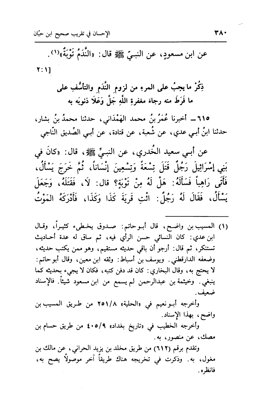 عَنْ أَبِي سَعِيدٍ الْخُدْرِيِّ عَنِ النَّبِيِّ صَلَّى اللَّهُ عَلَيْهِ وَسَلَّمَ قَالَ "كَانَ فِي بَنِي إِسْرَائِيلَ رَجُلٌ قَتَلَ تِسْعَةً وَتِسْعِينَ إِنْسَانًا ثُمَّ خَرَجَ يَسْأَلُ فَأَتَى رَاهِبًا فَسَأَلَهُ هَلْ لَهُ مِنْ تَوْبَةٍ قَالَ لَا فَقَتَلَهُ وَجَعَلَ يَسْأَلُ فقَالَ لَهُ رَجُلٌ ائْتِ قرية كذا وكذا فأدركه الموتذكر مَا يَجِبُ عَلَى الْمَرْءِ مِنْ لُزُومِ النَّدَمِ وَالتَّأَسُّفِ عَلَى مَا فَرَطَ مِنْهُ رَجَاءَ مَغْفِرَةِ اللَّهِ جَلَّ وَعَلَا ذُنُوبَهُ بِهِ