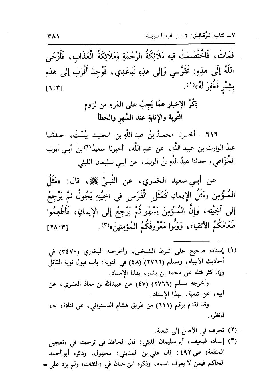 عَنْ أَبِي سَعِيدٍ الْخُدْرِيِّ عَنِ النَّبِيِّ صَلَّى اللَّهُ عَلَيْهِ وَسَلَّمَ قَالَ "مَثَلُ الْمُؤْمِنِ وَمَثَلُ الْإِيمَانِ كَمَثَلِ الْفَرَسِ فِي آخِيَّتِهِ يَجُولُ ثُمَّ يَرْجِعُ إِلَى آخِيَّتِهِ وَإِنَّ الْمُؤْمِنَ يَسْهُو ثُمَّ يَرْجِعُ إِلَى الْإِيمَانِ فَأَطْعِمُوا طعامكم الأتقياء وولوا معروفكم المؤمنين" 3. [3: 28]
