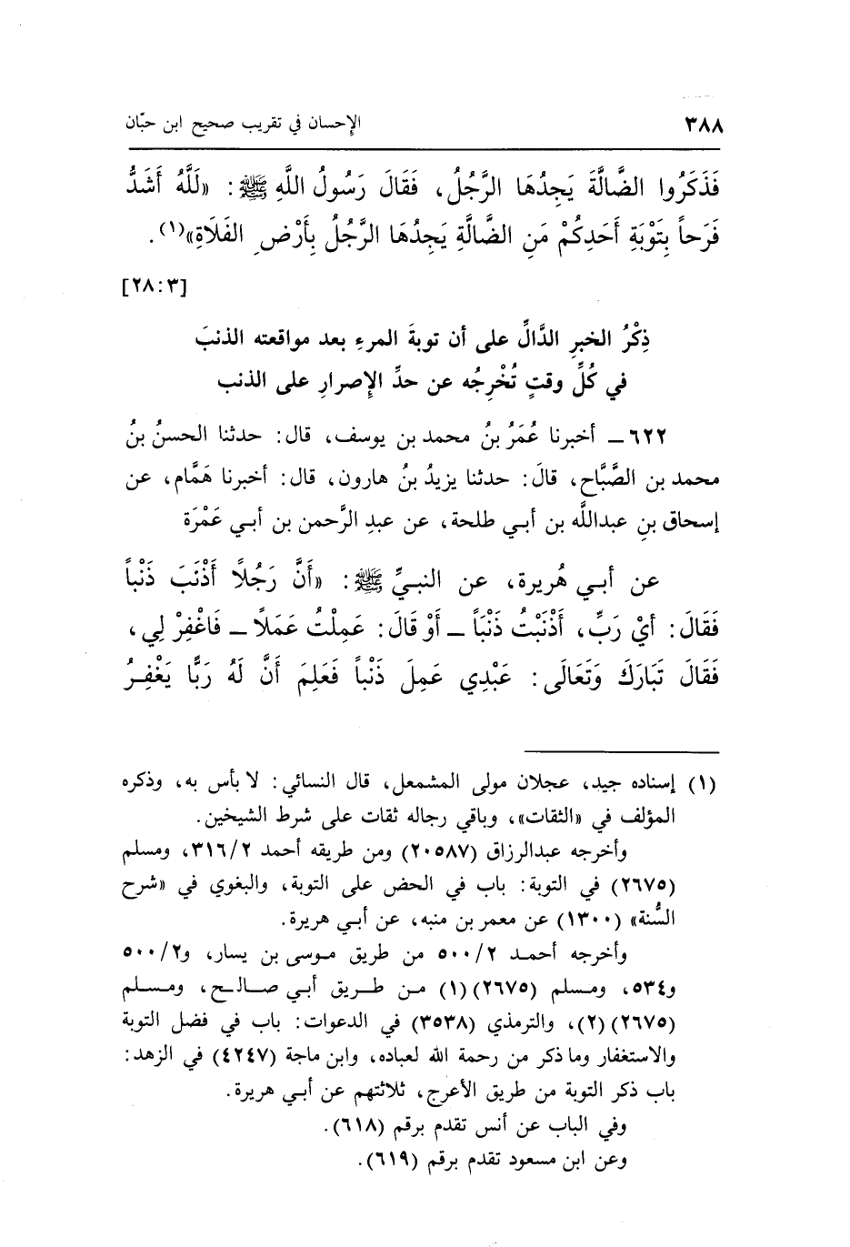 فَذَكَرُوا الضَّالَّةَ يَجِدُهَا الرَّجُلُ فقَالَ رَسُولُ اللَّهِ صَلَّى اللَّهُ عَلَيْهِ وَسَلَّمَ: "لَلَّهُ أَشَدُّ فَرَحًا بِتَوْبَةِ أَحَدِكُمْ مِنَ الضَّالَّةِ يَجِدُهَا الرَّجُلُ بِأَرْضِ الفلاة" 1. [3: 28]