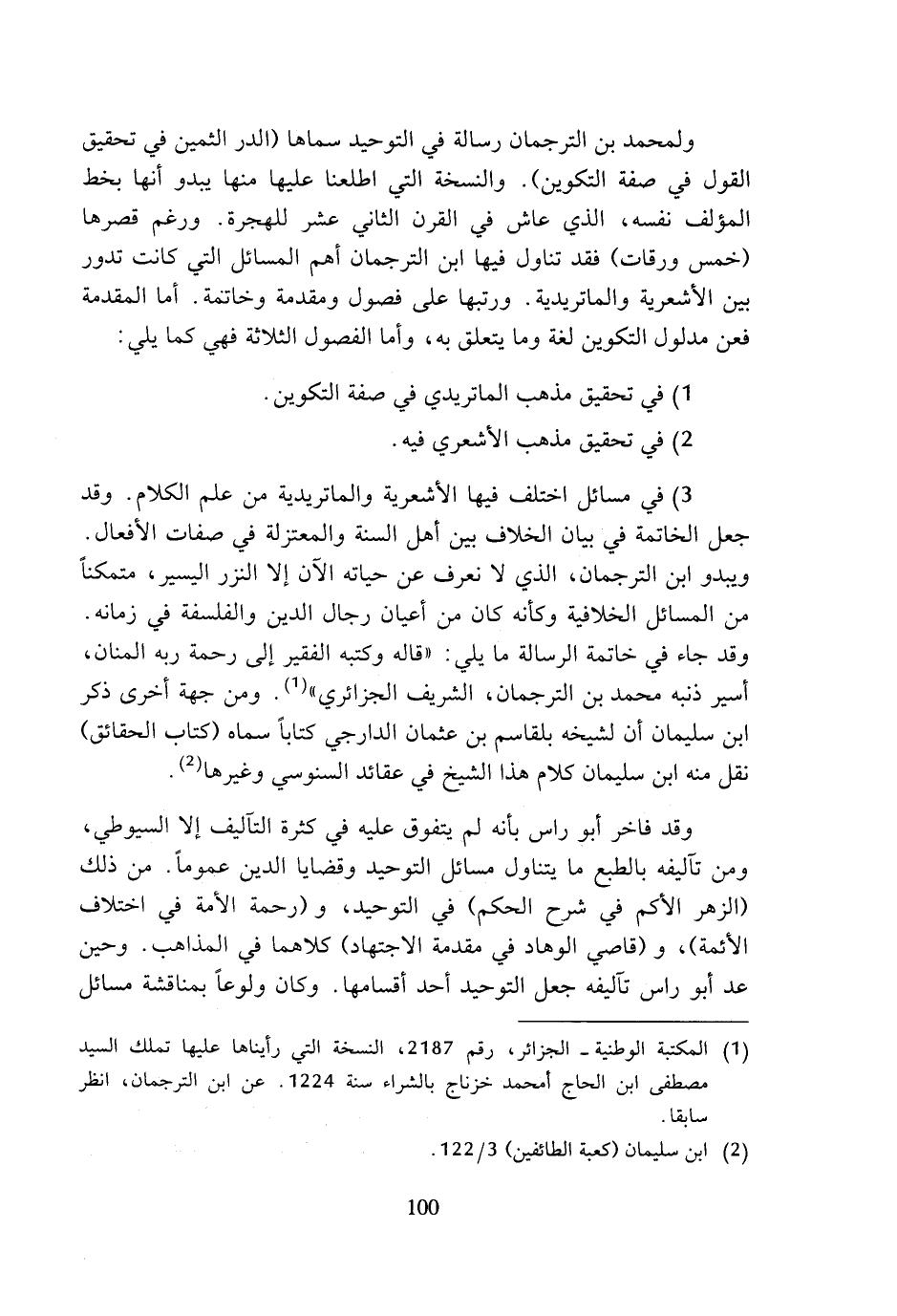 3) في مسائل اختلف فيها الأشعرية والماتريدية من علم الكلام. وقد جعل الخاتمة في بيان الخلاف بين أهل السنة والمعتزلة في صفات الأفعال. ويبدو ابن الترجمان، الذي لا نعرف عن حياته الآن إلا النزر اليسير، متمكنا من المسائل الخلافية وكأنه كان من أعيان رجال الدين والفلسفة في زمانه. وقد جاء في خاتمة الرسالة ما يلي: (قاله وكتبه الفقير إلى رحمة ربه المنان، أسير ذنبه محمد بن الترجمان، الشريف الجزائري) (¬1). ومن جهة أخرى ذكر ابن سليمان أن لشيخه بلقاسم بن عثمان الدارجي كتابا سماه (كتاب الحقائق) نقل منه ابن سليمان كلام هذا الشيخ في عقائد السنوسي وغيرها (¬2).