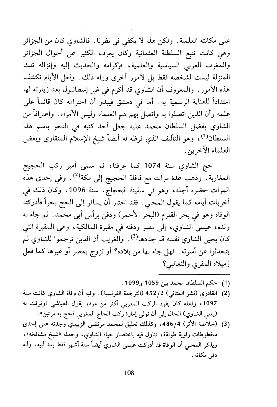 (¬2) القادري (نشر المثاني) 2/ 452 (الترجمة الفرنسية). وفيه أن وفاة الشاوي كانت سنة 1097، ولعله كان يقود الركب المغربي أكثر من مرة، يقول العياشي (وترقت به (يعني الشاوي) الحال إلى أن تولى إمارة ركب الحاج المغربي فحج به مرتين).