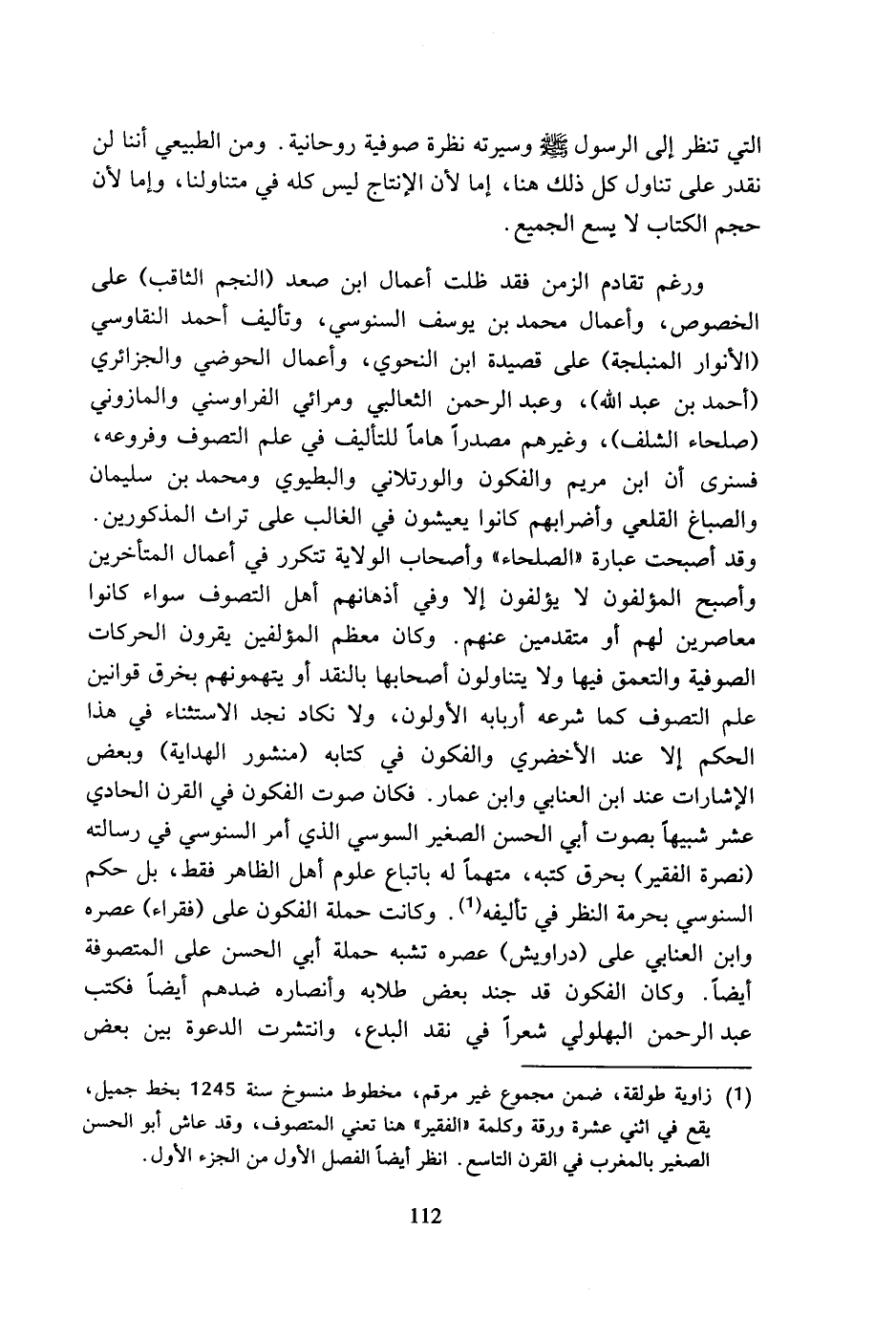 (¬1) زاوية طولقة، ضمن مجموع غير مرقم، مخطوط منسوخ سنة 1245 بخط جميل، يقع في اثني عشرة ورقة وكلمة (الفقير) هنا تعني المتصوف، وقد عاش أبو الحسن الصغير بالمغرب في القرن التاسع. انظر أيضا الفصل الأول من الجزء الأول.