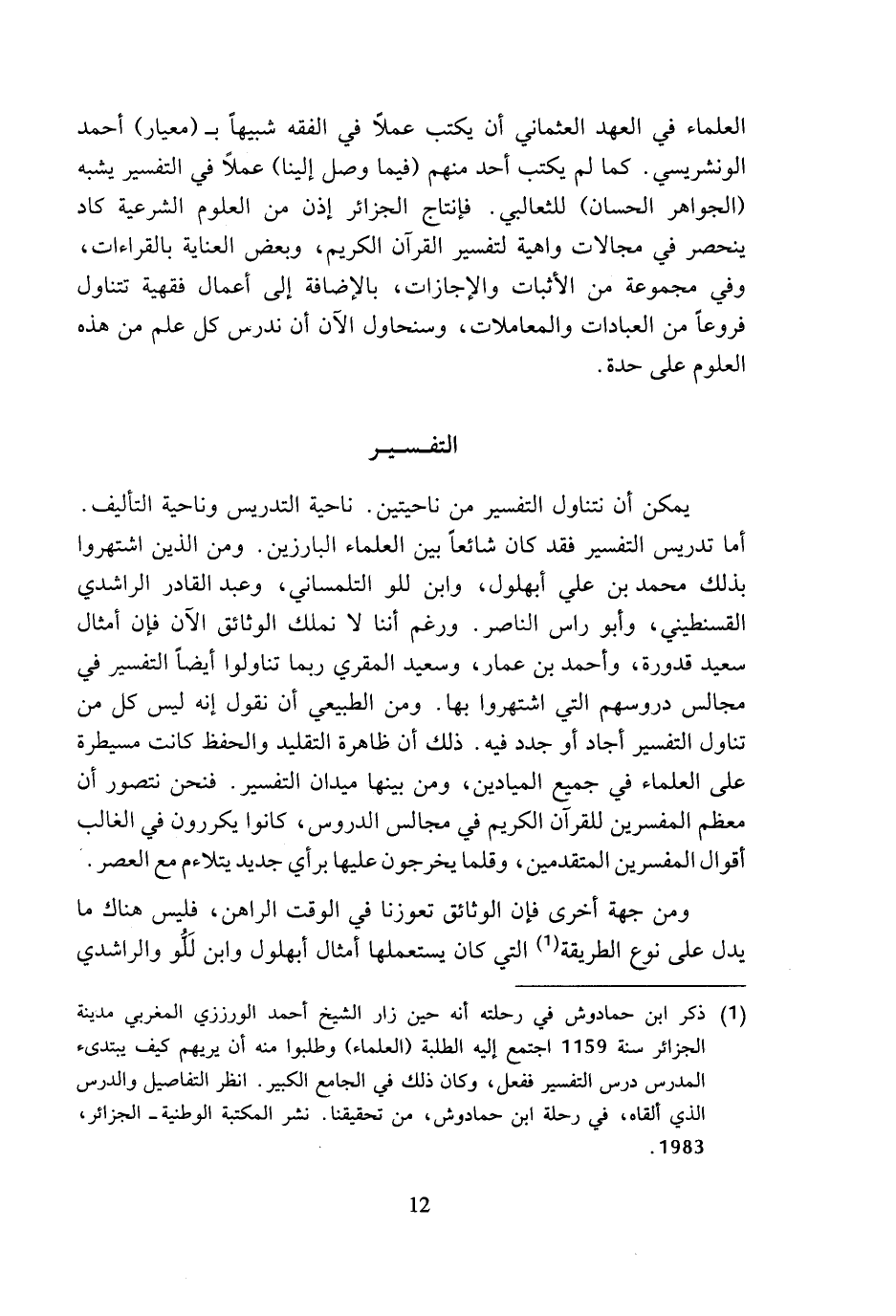 العلماء في العهد العثماني أن يكتب عملا في الفقه شبيها بـ (معيار) أحمد الونشريسي. كما لم يكتب أحد منهم (فيما وصل إلينا) عملا في التفسير يشبه (الجواهر الحسان) للثعالبي. فإنتاج الجزائر إذن من العلوم الشرعية كاد ينحصر في مجالات واهية لتفسير القرآن الكريم، وبعض العناية بالقراءات، وفي مجموعة من الأثبات والإجازات، بالإضافة إلى أعمال فقهية تتناول فروعا من العبادات والمعاملات، وسنحاول الآن أن ندرس كل علم من هذه العلوم على حدة.