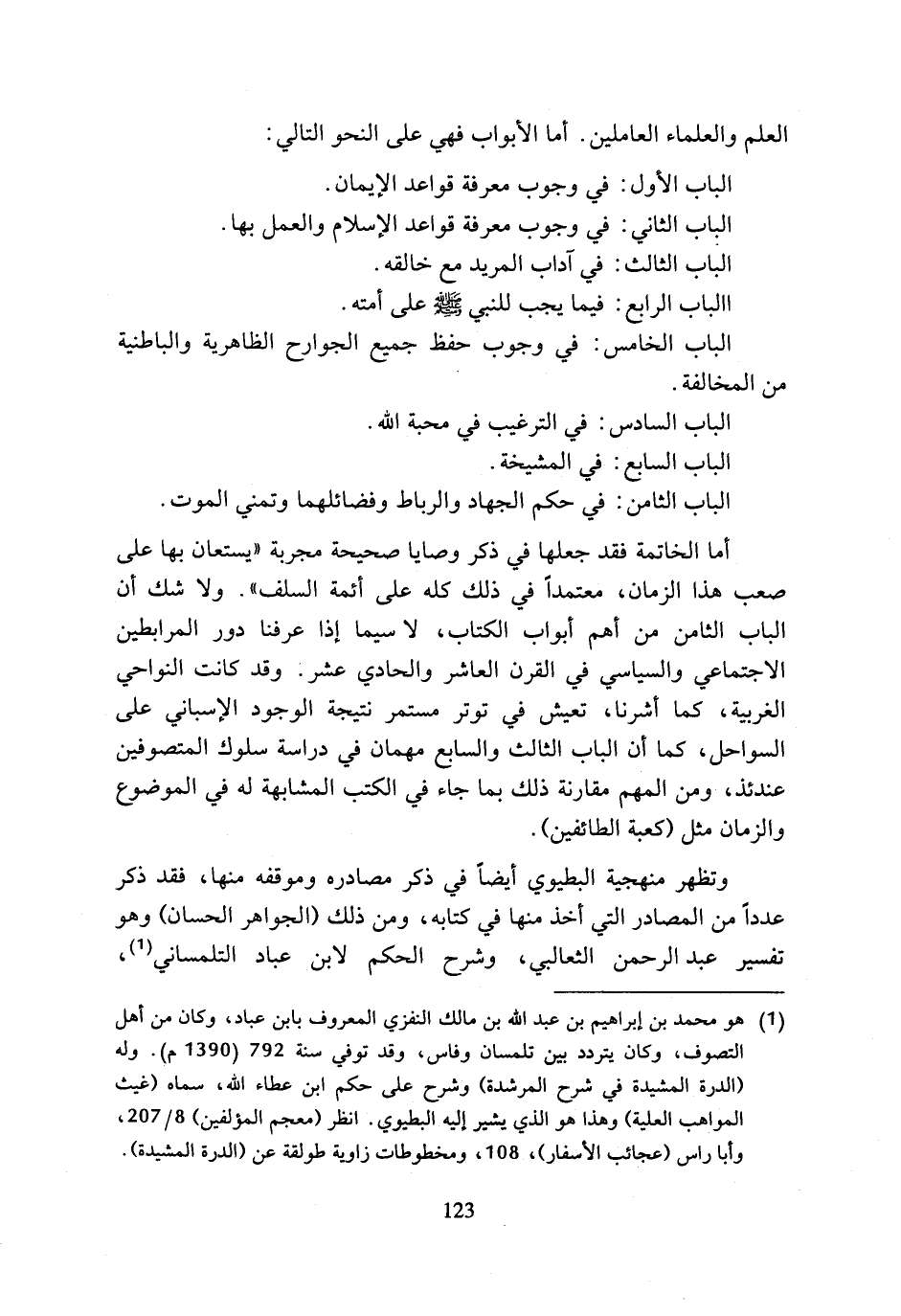(¬1) هو محمد بن إبراهيم بن عبد الله بن مالك الغزي المعروف بابن عباد، وكان من أهل التصوف، وكان يتردد بين تلمسان وفاس، وقد توفي سنة 792 (1390 م). وله (الدرة المشيدة في شرح المرشدة) وشرح على حكم ابن عطاء الله، سماه (غيث المواهب العلية) وهذا هو الذي يشير إليه البطيوي. انظر (معجم المؤلفين) 8/ 207، وأبا راس (عجائب الأسفار)، 108، ومخطوطات زاوية طولقة عن (الدرة المشيدة).