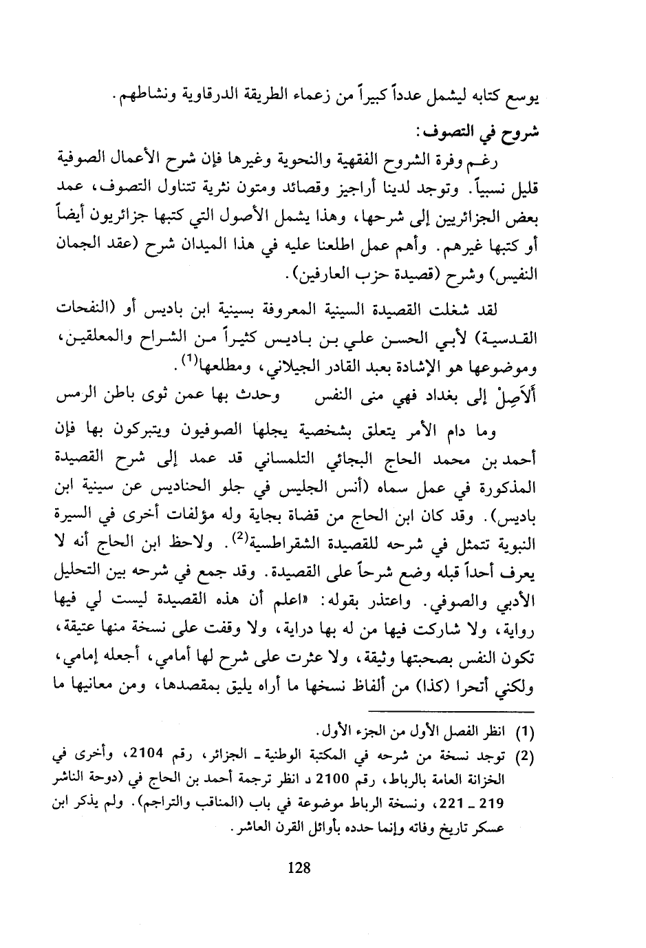 وما دام الأمر يتعلق بشخصية يجلها الصوفيون ويتبركون بها فإن أحمد بن محمد الحاج البجائي التلمساني قد عمد إلى شرح القصيدة المذكورة في عمل سماه (أنس الجليس في جلو الحناديس عن سينية ابن باديس). وقد كان ابن الحاج من قضاة بجاية وله مؤلفات أخرى في السيرة النبوية تتمثل في شرحه للقصيدة الشقراطسية (¬2). ولاحظ ابن الحاج أنه لا يعرف أحدا قبله وضع شرحا على القصيدة. وقد جمع في شرحه بين التحليل الأدبي والصوفي. واعتذر بقوله: (اعلم أن هذه القصيدة ليست لي فيها رواية، ولا شاركت فيها من له بها دراية، ولا وقفت على نسخة منها عتيقة، تكون النفس بصحبتها وثيقة، ولا عثرت على شرح لها أمامي، أجعله إمامي، ولكني أتحرا (كذا) من ألفاظ نسخها ما أراه يليق بمقصدها، ومن معانيها ما