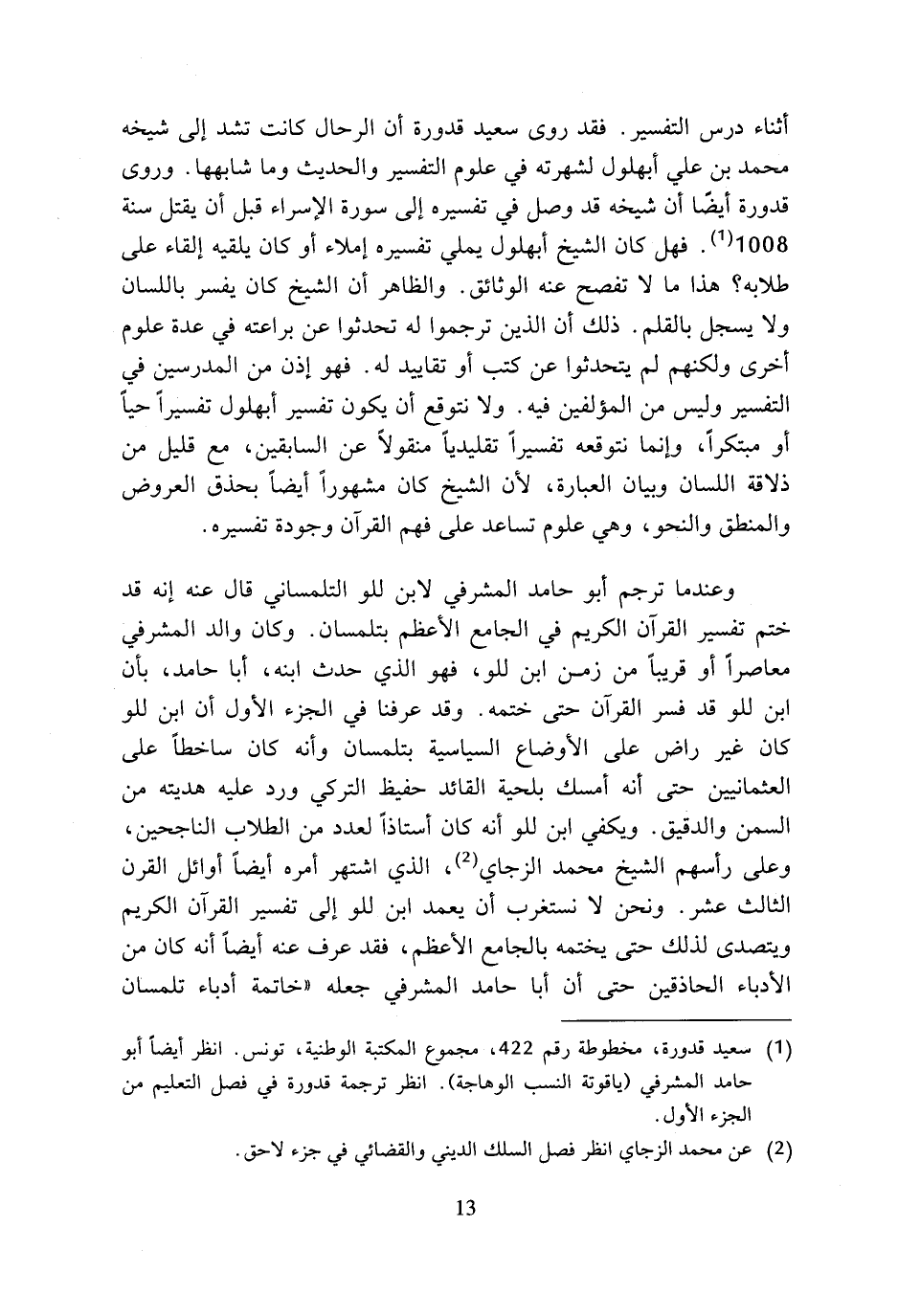 أثناء درس التفسير. فقد روى سعيد قدورة أن الرحال كانت تشد إلى شيخه محمد بن علي أبهلول لشهرته في علوم التفسير والحديث وما شابهها. وروى قدورة أيضا أن شيخه قد وصل في تفسيره إلى سورة الإسراء قبل أن يقتل سنة 1008 (¬1). فهل كان الشيخ أبهلول يملي تفسيره إملاء أو كان يلقيه إلقاء على طلابه؟ هذا ما لا تفصح عنه الوثائق. والظاهر أن الشيخ كان يفسر باللسان ولا يسجل بالقلم. ذلك أن الذين ترجموا له تحدثوا عن براعته في عدة علوم أخرى ولكنهم لم يتحدثوا عن كتب أو تقاييد له. فهو إذن من المدرسين في التفسير وليس من المؤلفين فيه. ولا نتوقع أن يكون تفسير أبهلول تفسيرا حيا أو مبتكرا، وإنما نتوقعه تفسيرا تقليديا منقولا عن السابقين، مع قليل من ذلاقة اللسان وبيان العبارة، لأن الشيخ كان مشهورا أيضا بحذق العروض والمنطق والنحو، وهي علوم تساعد على فهم القرآن وجودة تفسيره.