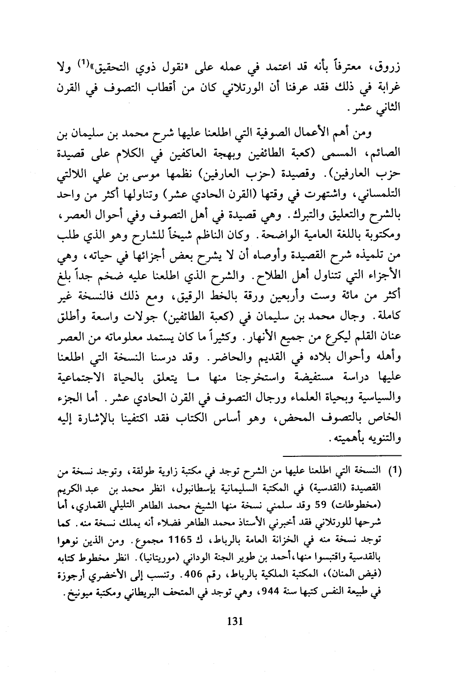 زروق، معترفا بأنه قد اعتمد في عمله على (نقول ذوي التحقيق) (¬1) ولا غرابة في ذلك فقد عرفنا أن الورتلاني كان من أقطاب التصوف في القرن الثاني عشر.