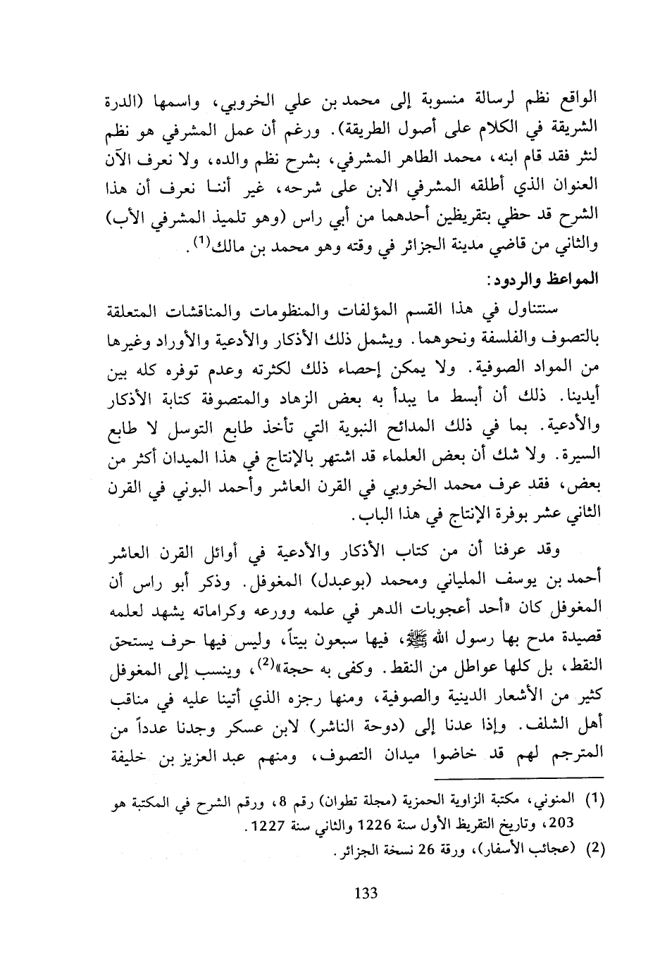 وقد عرفنا أن من كتاب الأذكار والأدعية في أوائل القرن العاشر أحمد بن يوسف الملياني ومحمد (بوعبدل) المغوفل. وذكر أبو راس أن المغوفل كان (أحد أعجوبات الدهر في علمه وورعه وكراماته يشهد لعلمه قصيدة مدح بها رسول الله (صلى الله عليه وسلم)، فيها سبعون بيتا، وليس فيها حرف يستحق النقط، بل كلها عواطل من النقط. وكفى به حجة) (¬2)، وينسب إلى المغوفل كثير من الأشعار الدينية والصوفية، ومنها رجزه الذي أتينا عليه في مناقب أهل الشلف. وإذا عدنا إلى (دوحة الناشر) لابن عسكر وجدنا عددا من المترجم لهم قد خاضوا ميدان التصوف، ومنهم عبد العزيز بن خليفة