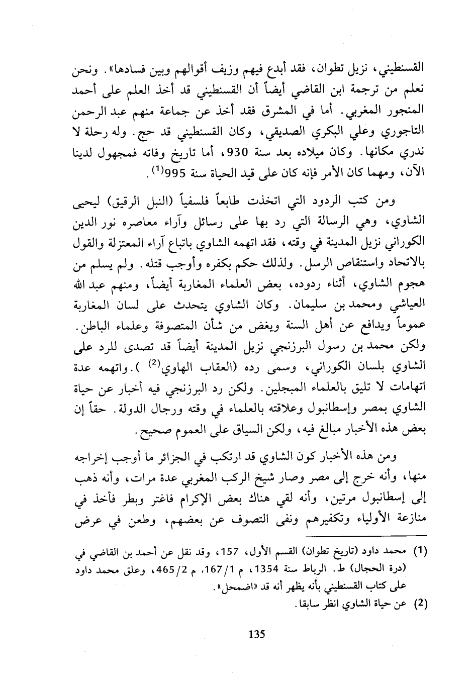 القسنطيني، نزيل تطوان، فقد أبدع فيهم وزيف أقوالهم وبين فسادها). ونحن نعلم من ترجمة ابن القاضي أيضا أن القسنطيني قد أخذ العلم على أحمد المنجور المغربي. أما في المشرق فقد أخذ عن جماعة منهم عبد الرحمن التاجوري وعلي البكري الصديقي، وكان القسنطيني قد حج. وله رحلة لا ندري مكانها. وكان ميلاده بعد سنة 930، أما تاريخ وفاته فمجهول لدينا الآن، ومهما كان الأمر فإنه كان على قيد الحياة سنة 995 (¬1).