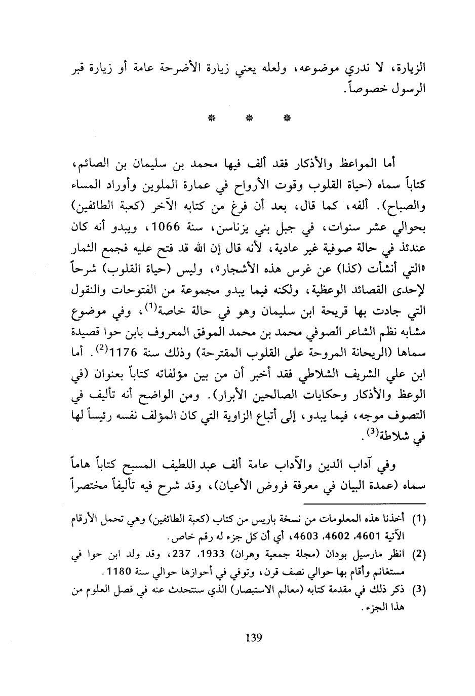بحوالي عشر سنوات، في جبل بني يزناسن، سنة 1066، ويبدو أنه كان عندئذ في حالة صوفية غير عادية، لأنه قال إن الله قد فتح عليه فجمع الثمار (التي أنشأت (كذا) عن غرس هذه الأشجار)، وليس (حياة القلوب) شرحا لإحدى القصائد الوعظية، ولكنه فيما يبدو مجموعة من الفتوحات والنقول التي جادت بها قريحة ابن سليمان وهو في حالة خاصة (¬1)، وفي موضع مشابه نظم الشاعر الصوفي محمد بن محمد الموفق المعروف بابن حوا قصيدة سماها (الريحانة المروحة على القلوب المقترحة) وذلك سنة 1176 (¬2). أما ابن علي الشريف الشلاطي فقد أخبر أن من بين مؤلفاته كتابا بعنوان (في الوعظ والأذكار وحكايات الصالحين الأبرار). ومن الواضح أنه تأليف في التصوف موجه، فيما يبدو، إلى أتباع الزاوية التي كان المؤلف نفسه رئيسا لها في شلاطة (¬3).
