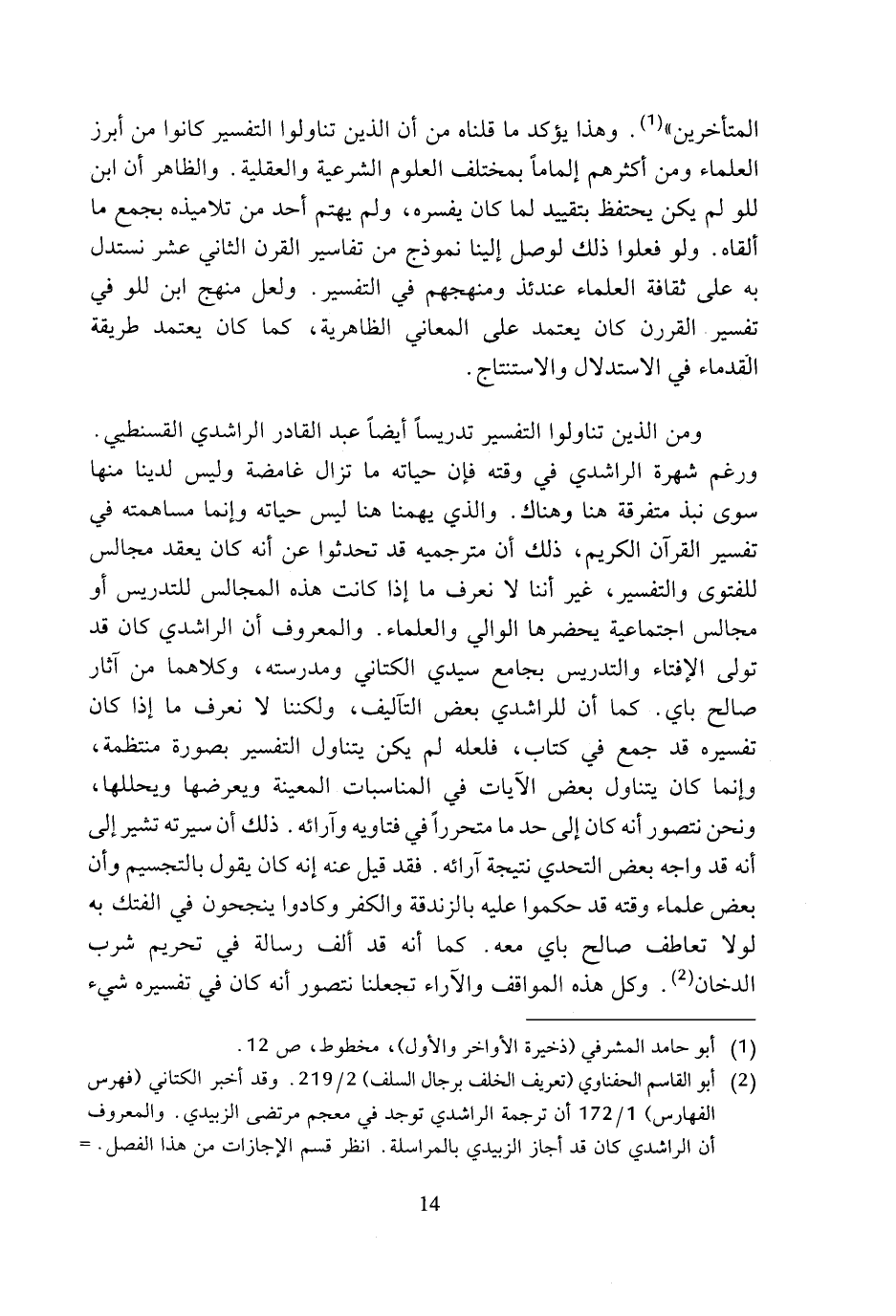 ورغم شهرة الراشدي في وقته فإن حياته ما تزال غامضة وليس لدينا منها سوى نبذ متفرقة هنا وهناك. والذي يهمنا هنا ليس حياته وإنما مساهمته في تفسير القرآن الكريم، ذلك أن مترجميه قد تحدثوا عن أنه كان يعقد مجالس للفتوى والتفسير، غير أننا لا نعرف ما إذا كانت هذه المجالس للتدريس أو مجالس اجتماعية يحضرها الوالي والعلماء. والمعروف أن الراشدي كان قد تولى الإفتاء والتدريس بجامع سيدي الكتاني ومدرسته، وكلاهما من آثار صالح باي. كما أن للراشدي بعض التآليف، ولكننا لا نعرف ما إذا كان تفسيره قد جمع في كتاب، فلعله لم يكن يتناول التفسير بصورة منتظمة، وإنما كان يتناول بعض الآيات في المناسبات المعينة ويعرضها ويحللها، ونحن نتصور أنه كان إلى حد ما متحررا في فتاويه وآرائه. ذلك أن سيرته تشير إلى أنه قد واجه بعض التحدي نتيجة آرائه. فقد قيل عنه إنه كان يقول بالتجسيم وأن بعض علماء وقته قد حكموا عليه بالزندقة والكفر وكادوا ينجحون في الفتك به لولا تعاطف صالح باي معه. كما أنه قد ألف رسالة في تحريم شرب الدخان (¬2). وكل هذه المواقف والآراء تجعلنا نتصور أنه كان في تفسيره شيء