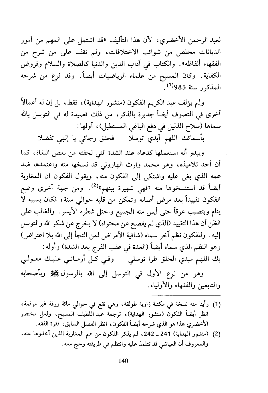 (¬1) رأينا منه نسخة في مكتبة زاوية طولقة، وهي تقع في حوالي مائة ورقة غير مرقمة، انظر أيضا الفكون (منشور الهداية)، ترجمة عبد اللطيف المسبح، ولعل مختصر الأخضري هذا هو الذي شرحه أيضا الفكون، انظر الفصل السابق، فقرة الفقه.