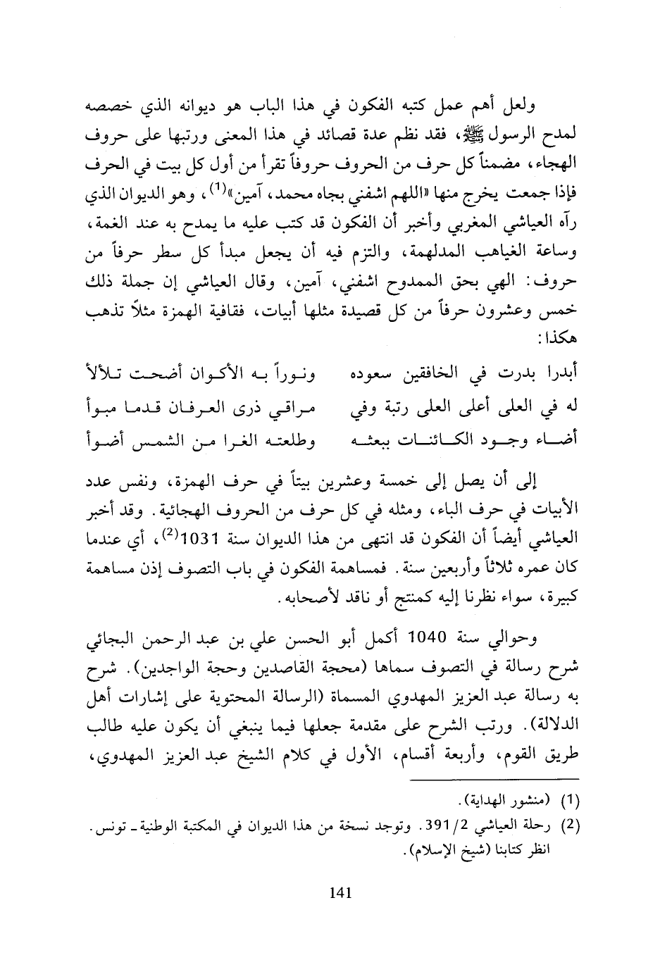 إلى أن يصل إلى خمسة وعشرين بيتا في حرف الهمزة، ونفس عدد الأبيات في حرف الباء، ومثله في كل حرف من الحروف الهجائية. وقد أخبر العياشي أيضا أن الفكون قد انتهى من هذا الديوان سنة 1031 (¬2)، أي عندما كان عمره ثلاثا وأربعين سنة. فمساهمة الفكون في باب التصوف إذن مساهمة كبيرة، سواء نظرنا إليه كمنتج أو ناقد لأصحابه.