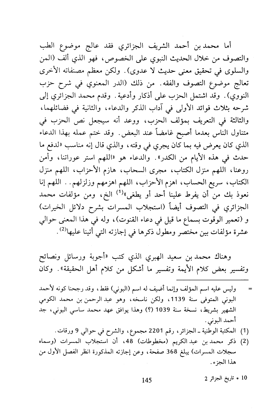 أما محمد بن أحمد الشريف الجزائري فقد عالج موضوع الطب والتصوف من خلال الحديث النبوي على الخصوص، فهو الذي ألف (المن والسلوى في تحقيق معنى حديث لا عدوى). ولكن معظم مصنفاته الأخرى تعالج موضوع التصوف والفقه. من ذلك (الدر المعنوي في شرح حزب النووي). وقد اشتمل الحزب على أذكار وأدعية. وقدم محمد الجزائري إلى شرحه بثلاث فوائد الأولى في آداب الذكر والدعاء، والثانية في فضائلهما، والثالثة في التعريف بمؤلف الحزب، ووعد أنه سيجعل نص الحزب في متناول الناس بعدما أصبح غامضا عند البعض. وقد ختم عمله بهذا الدعاء الذي كان يعرض فيه بما كان يجري في وقته، والذي قال إنه مناسب (لدفع ما حدث في هذه الأيام من الكدر). والدعاء هو (اللهم استر عوراتنا، وأمن روعنا، اللهم منزل الكتاب، مجرى السحاب، هازم الأحزاب، اللهم منزل الكتاب، سريع الحساب، اهزم الأحزاب، اللهم اهزمهم وزلزلهم .. اللهم إنا نعوذ بك من أن يفرط علينا أحد أو يطغى) (¬1) الخ، ومن مؤلفات محمد الجزائري في التصوف أيضا (استجلاب المسرات بشرح دلائل الخيرات) و (تعمير الوقوت بسمع ما قيل في دعاء القنوت)، وله في هذا المعنى حوالي عشرة مؤلفات بين مختصر ومطول ذكرها في إجازته التي أتينا عليها (¬2).