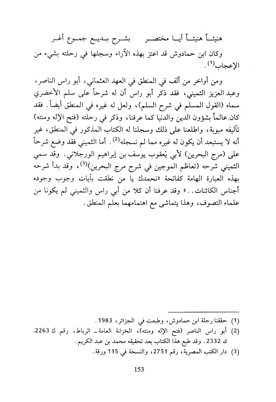 ومن أواخر من ألف في المنطق في العهد العثماني، أبو راس الناصر، وعبد العزيز الثميني، فقد ذكر أبو راس أن له شرحا على سلم الأخضري سماه (القول المسلم في شرح السلم)، ولعل له غيره في المنطق أيضا. فقد كان عالما بشؤون الدين والدنيا كما عرفنا، وذكر في رحلته (فتح الإله ومنته) تآليفه مبوبة، واطلعنا على ذلك وسجلنا له الكتاب المذكور في المنطق، غير أنه لا يستبعد أن يكون له غيره مما لم نسجله (¬2). أما الثميني فقد وضع شرحا على (مرج البحرين) لأبي يعقوب يوسف بن إبراهيم الورجلاني. وقد سمي الثميني شرحه (تعاظم الموجين في شرح مرج البحرين) (¬3)، وقد بدأ شرحه بهذه العبارة الهامة كفاتحة (نحمدك يا من نطقت بآيات وجوب وجوده أجناس الكائنات ..) وقد عرفنا أن كلا من أبي راس والثميني لم يكونا من علماء التصوف، وهذا يتماشى مع اهتمامهما بعلم المنطق.