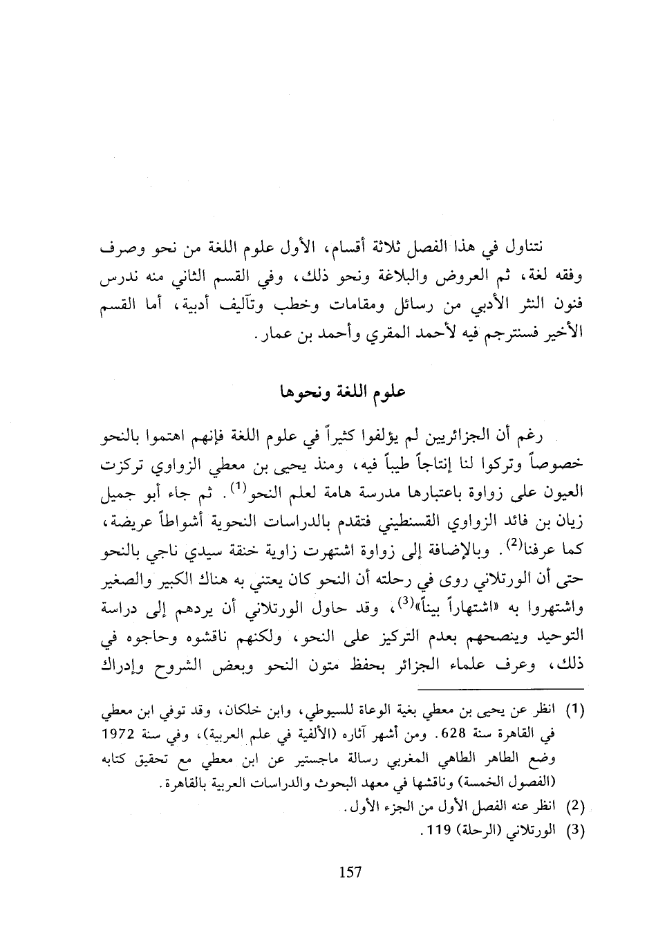 رغم أن الجزائريين لم يؤلفوا كثيرا في علوم اللغة فإنهم اهتموا بالنحو خصوصا وتركوا لنا إنتاجا طيبا فيه، ومنذ يحيى بن معطي الزواوي تركزت العيون على زواوة باعتبارها مدرسة هامة لعلم النحو (¬1). ثم جاء أبو جميل زيان بن فائد الزواوي القسنطيني فتقدم بالدراسات النحويه أشواطا عريضة، كما عرفنا (¬2). وبالإضافة إلى زواوة اشتهرت زاوية خنقة سيدي ناجي بالنحو حتى أن الورتلاني روى في رحلته أن النحو كان يعتني به هناك الكبير والصغير واشتهروا به (اشتهارا بينا) (¬3)، وقد حاول الورتلاني أن يردهم إلى دراسة التوحيد وينصحهم بعدم التركيز على النحو، ولكنهم ناقشوه وحاجوه في ذلك، وعرف علماء الجزائر بحفظ متون النحو وبعض الشروح وإدراك