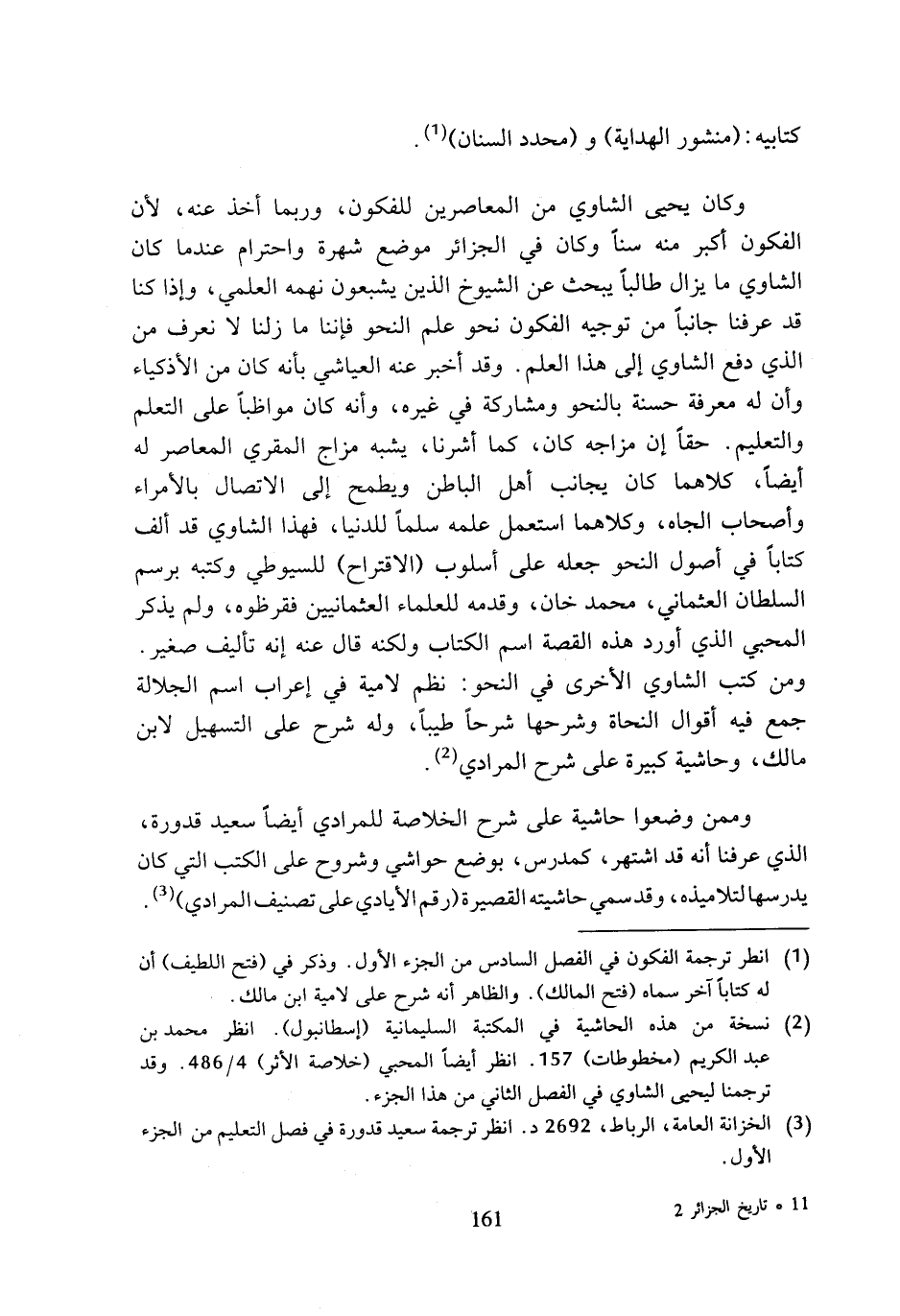 (¬2) نسخة من هذه الحاشية في المكتبة السليمانية (إسطانبول). انظر محمد بن عبد الكريم (مخطوطات) 157. انظر أيضا المحبي (خلاصة الأثر) 4/ 486. وقد ترجمنا ليحيى الشاوي في الفصل الثاني من هذا الجزء.