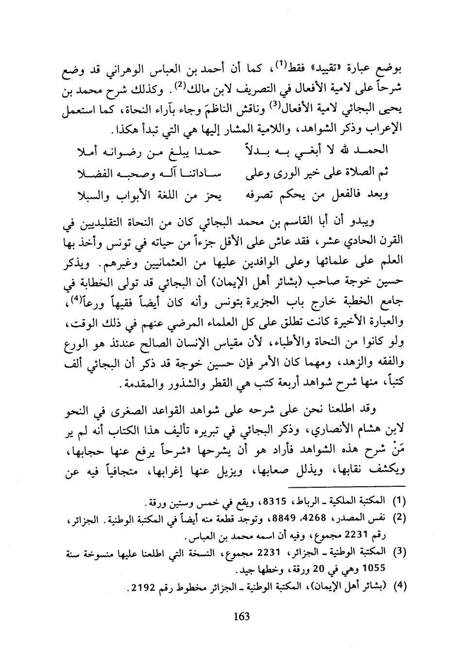بوضع عبارة (تقييد) فقط (¬1)، كما أن أحمد بن العباس الوهراني قد وضع شرحا على لامية الأفعال في التصريف لابن مالك (¬2). وكذلك شرح محمد بن يحيى البجائي لامية الأفعال (¬3) وناقش الناظم وجاء بآراء النحاة، كما استعمل الإعراب وذكر الشواهد، واللامية المشار إليها هي التي تبدأ هكذا.