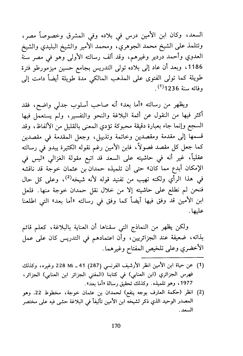 (¬2) انظر (حكمة العارف بوجه ينفع) لحمدان بن عثمان خوجة، مخطوط 22، وهو المصدر الوحيد الذي ذكر لشيخه ابن الأمين تأليفا في البلاغة حشى فيه على مختصر السعد.