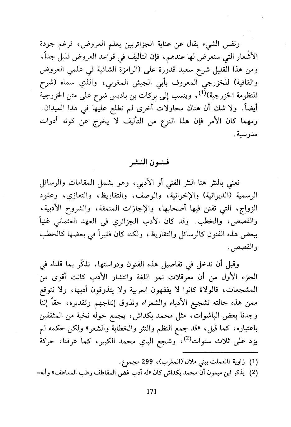 ونفس الشيء يقال عن عناية الجزائريين بعلم العروض، فرغم جودة الأشعار التي سنعرض لها عندهم، فإن التأليف في قواعد العروض قليل جدا، ومن هذا القليل شرح سعيد قدورة على (الرامزة الشافية في علمي العروض والقافية) للخزرجي المعروف بأبي الجيش المغربي، والذي سماه (شرح المنظومة الخزرجية) (¬1)، وينسب إلى بركات بن باديس شرح على متن الخزرجية أيضا. ولا شك أن هناك محاولات أخرى لم نطلع عليها في هذا الميدان. ومهما كان الأمر فإن هذا النوع من التأليف لا يخرج عن كونه أدوات مدرسيه.